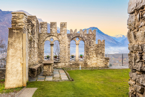 Sich links haltend geht man um die Skipiste herum und steigt wieder hinauf in Richtung einer Ruine. Kaum an ihr vorbei geht es zum Stützpfeiler des Sesselliftes Prel, um dann nach links auf den Weg zu biegen, der in den Wald führt. (weiß-rotes Schild “Ski Alp”).