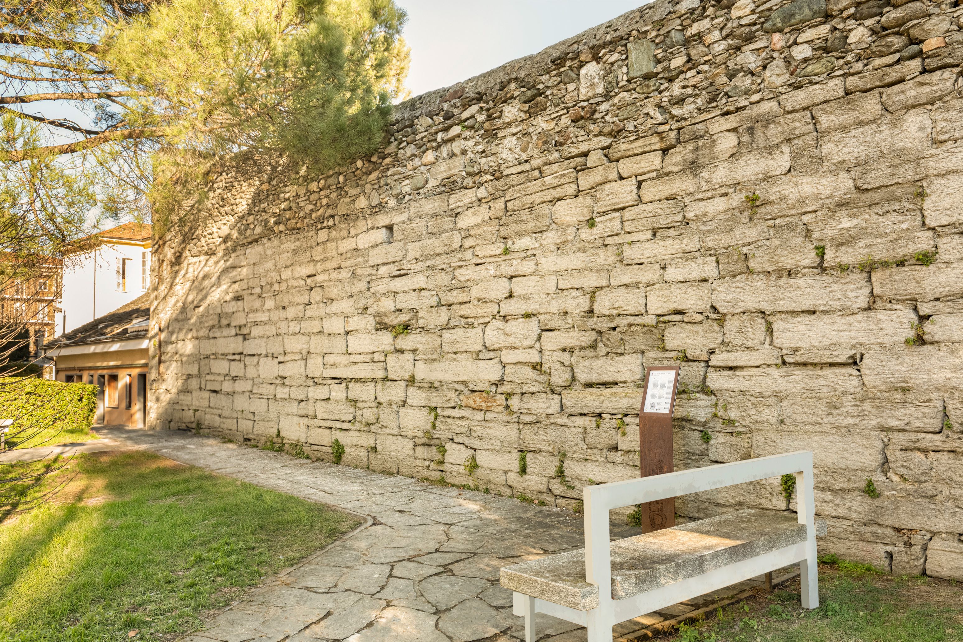 Some sections of the walls remain today, particularly along Via Canuto, Via Monte Grappa and Via Facchinetti, equipped with guard walkways and shelters with embrasures, crowned by Guelph battlements. The remains of a corner tower in Via Canuto and the turret in Via Monte Grappa are also preserved. The latter has recently undergone restoration work with the creation of an amphitheatre all around it, used for cultural meetings and performances.