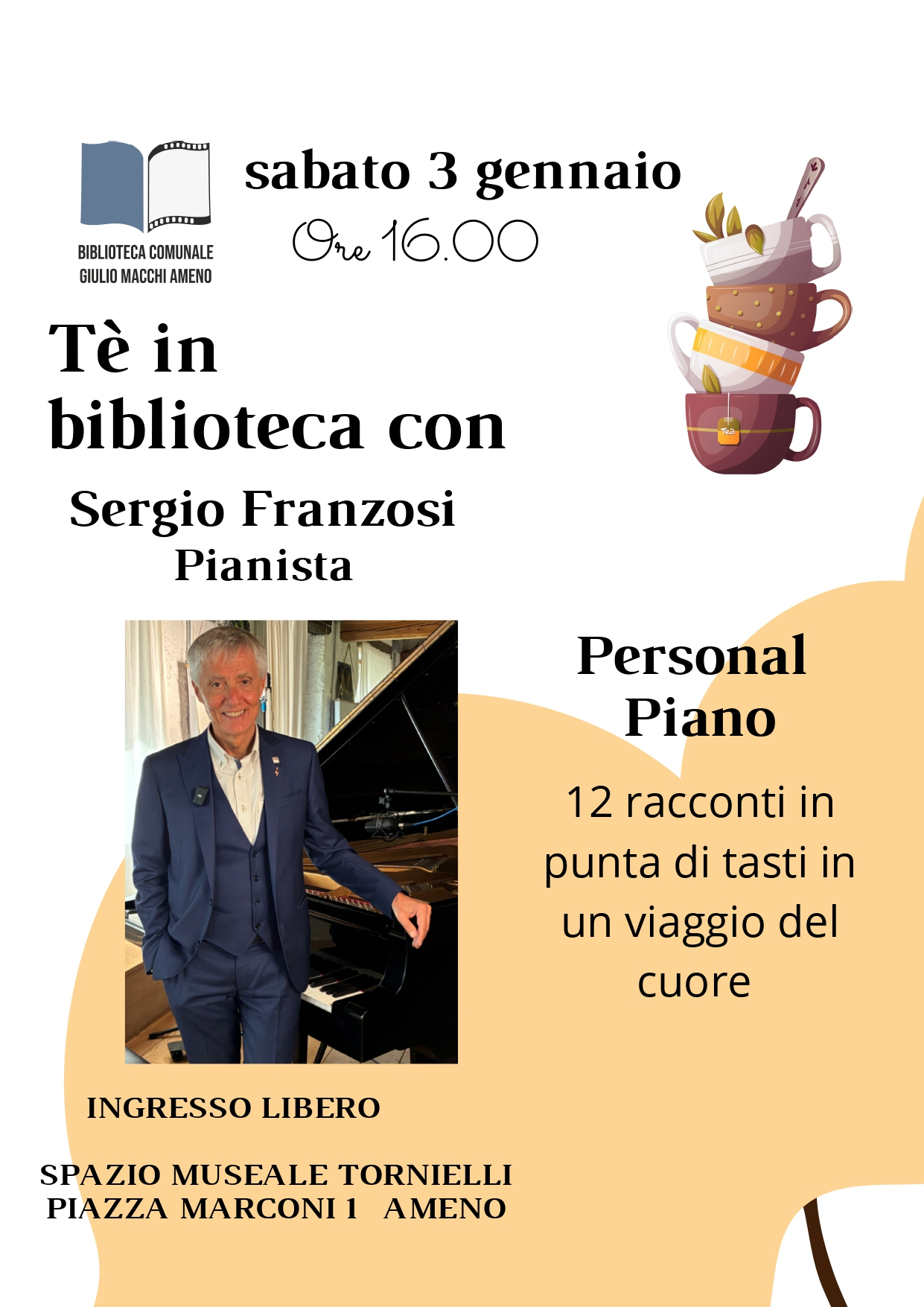 Sabato 3 gennaio 2026 alle ore 16.00 presso lo Spazio Museale Tornielli si terrà un appuntamento culturale con il concerto speciale di Sergio Franzos. Il pianista e compositore Sergio Franzosi presenterà anche il suo nuovo album “Personal Piano”.
