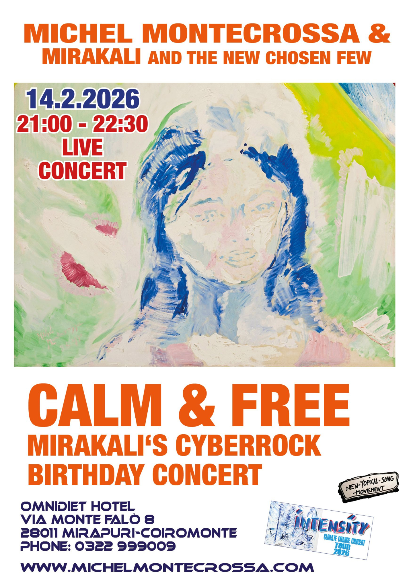 Sabato 14 Febbraio 2026 avrà luogo a Mirapuri il Concerto Cyberrock per il compleanno di Mirakali. Michel Montecrossa ed il suo gruppo The New Chosen Few suonano il Concerto intitolato 'CALM & FREE' Mirakali's Cyberrock Birthday Concert presso il Music Hall dell'Omnidiet Hotel (Via Monte Falò 8, Mirapuri-Coiromonte, tel: 0322-999009). Il Concerto comincia alle 21:00 e presenta grandi canzoni Cyberrock e Dance-Elettronica di Michel Montecrossa e Mirakali. Una serata indimenticabile per tutti i fan e amanti di musica per ballare e festeggiare insieme!