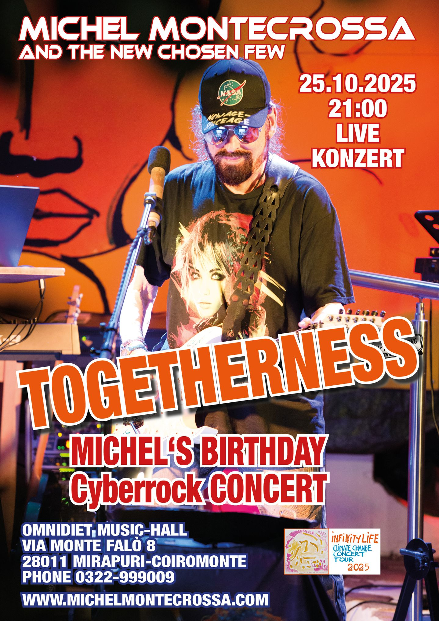 Sabato 25 Ottobre 2025 avrà luogo il Concerto di Compleanno di Michel Montecrossa a Mirapuri - Michel Montecrossa ed il suo gruppo The New Chosen Few suonano il Concerto Cyberrock intitolato 'Togetherness' presso il Music Hall dell'Omnidiet Hotel (Via Monte Falò 8, Mirapuri-Coiromonte, tel: 0322-999009). Il Concerto comincia alle 21:00 e presenta grandi canzoni Cyberrock e Dance-Elettronica di Michel Montecrossa e Mirakali. Una serata indimenticabile per tutti i fan e amanti di musica per ballare e festeggiare insieme!