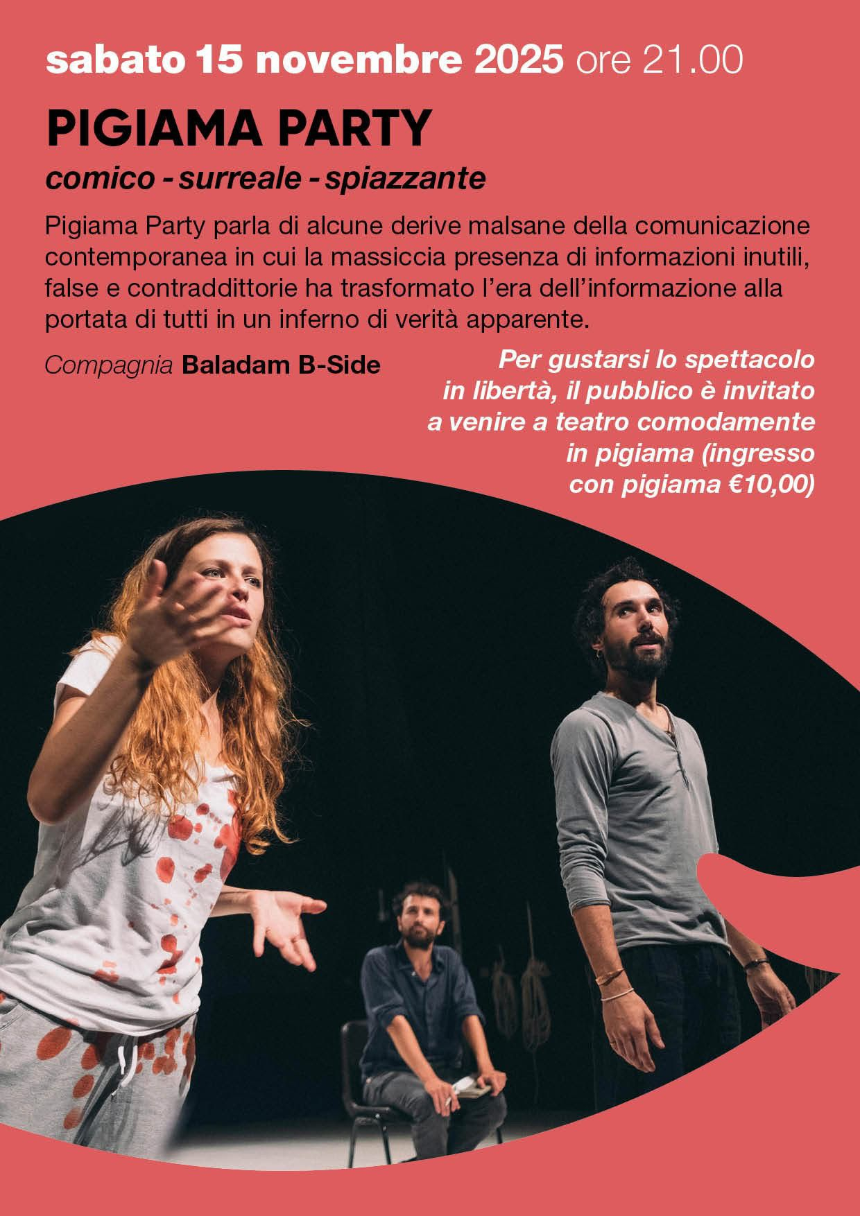 Uno spettacolo sulla fine dell’adolescenza, su un’età adulta che ha dimenticato le possibilità sociali del gioco immaginativo, e che non comprende più il piacere misterioso ed erotico di partecipare a un pigiama party fuori dal controllo parentale. Con grande ironia analizza alcune derive malsane della comunicazione contemporanea in un periodo storico in cui la massiccia presenza di informazioni inutili, false e contraddittorie  ha trasformato l’era dell’informazione alla portata di tutti in un inferno di sovrastrutture identitarie e verità fittizie, in cui diventa sempre più difficile attivare una propria interpretazione personale non strumentalizzata.
