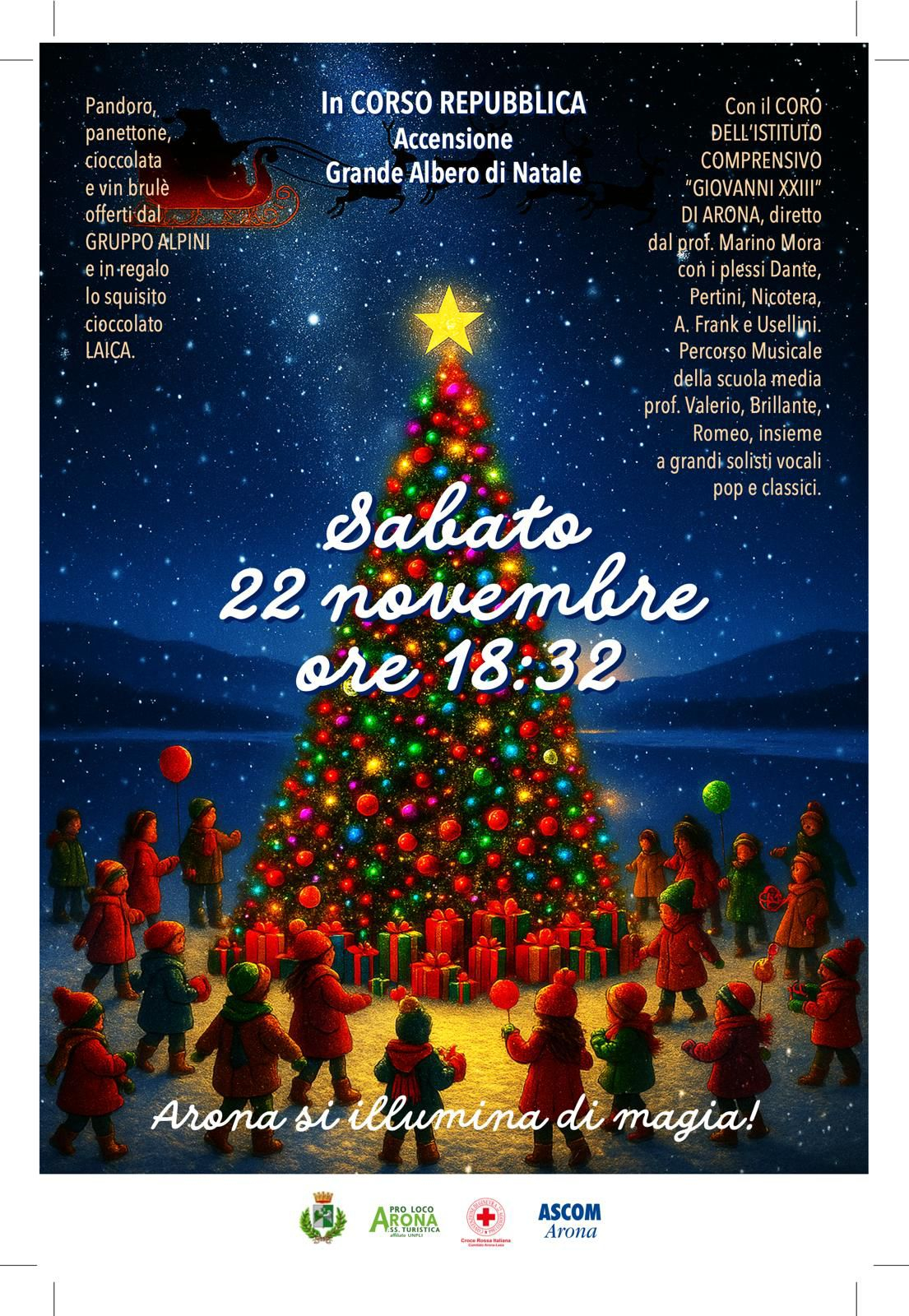 Dalle 17.45 in Corso della Repubblica, canti tradizionali del CORO dell’I.C. “PAPA GIOVANNI XXIII” di Arona, diretto dal prof. Marino Mora con i plessi Dante, Pertini, Nicotera, A. Frank, Usellini e il percorso musicale della scuola media, insieme ai proff. Valerio, Brillante, Romeo e grandi solisti vocali pop e classici. Pandoro, panettone, cioccolata calda e vin brulè offerti dal GRUPPO ALPINI di Arona e in regalo lo squisito cioccolato LAICA. In occasione dell’Accensione dell’Albero AUTOARONA distribuirà dei gadget per tutti i bambini e ARONA ACTIVE dei VOUCHER per una settimana gratuita di allenamento.