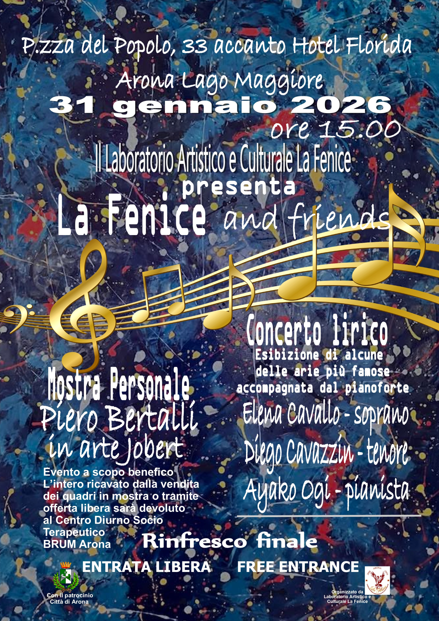 In occasione dei dieci anni d’attività, il Laboratorio Artistico e Culturale La Fenice nei locali in piazza del popolo 33, accanto Hotel Florida, Arona, ha organizzato per sabato 31 gennaio 2026 alle ore 15.00 un evento benefico “La Fenice and friends”, dove l’Arte e la Musica si stringono in nome della Solidarietà, in questo caso raccogliere fondi in favore del Centro Diurno Socio Terapeutico Brum di Arona. Si potrà ammirare la Mostra Personale di Piero Bertalli in arte Jobert e ascoltare il Concerto di Musica Lirica ad opera di tre artisti di fama internazionale, il soprano Elena Cavallo, il tenore Diego Cavazzin e la pianista giapponese Ayako Ogi.