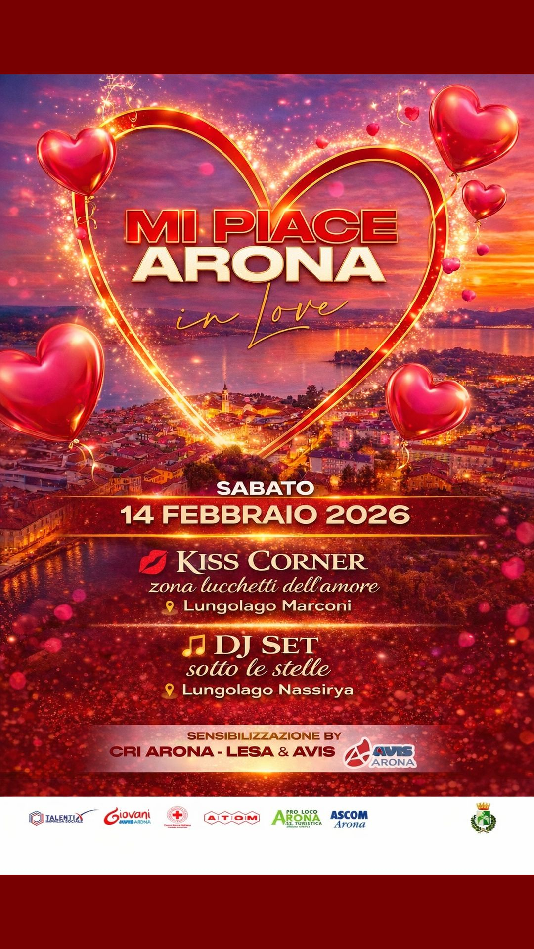 Sabato 14 febbraio Arona organizza la prima festa di San Valentino intitolata “Mi Piace Arona in Love” con Kiss Corner e Lucchetta il tuo cuore - dalle 21:30 alle 01:30 presso il Lungolago Dj set con AtomX e sensibilizzazione con CRI Arona/Lesa e AVIS Arona.