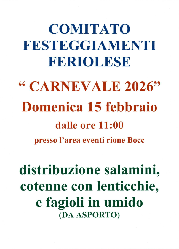 In occasione del carnevale 2026, distribuzione salamini, cotenne con lenticchie e fagioli in umido (solo da asporto).