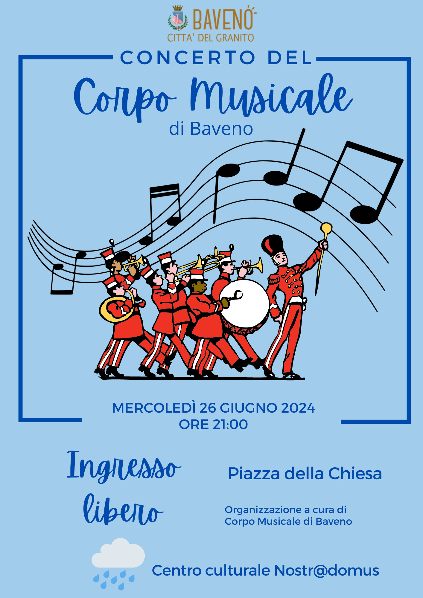 Mercoledì 26 giugno 2024, ore 21.00 Concerto del Corpo Musicale di Baveno, che spazia dai classici alla musica contemporanea. Ingresso libero. In caso di maltempo il concerto si terrà presso il Centro Culturale Nostr@domus. Organizzazione a cura del Corpo Musicale di Baveno in collaborazione con Città di Baveno.