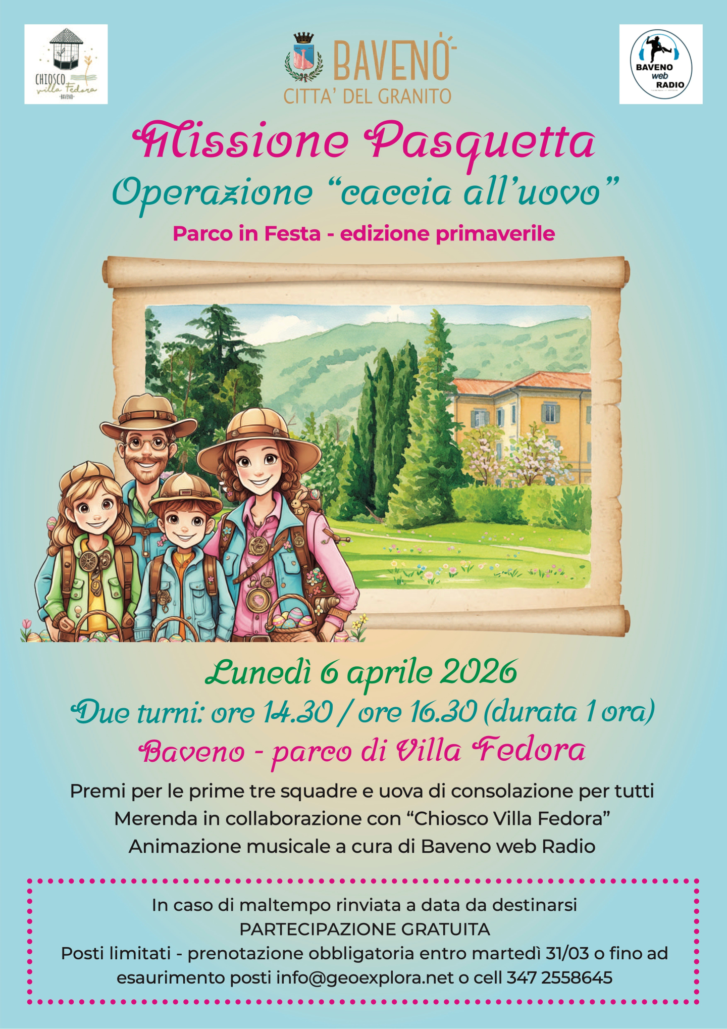 Ogni nucleo familiare costituirà una squadra: muniti di indizi e risolvendo indovinelli, si andrà alla ricerca delle uova nascoste nel bellissimo Parco di Villa Fedora.