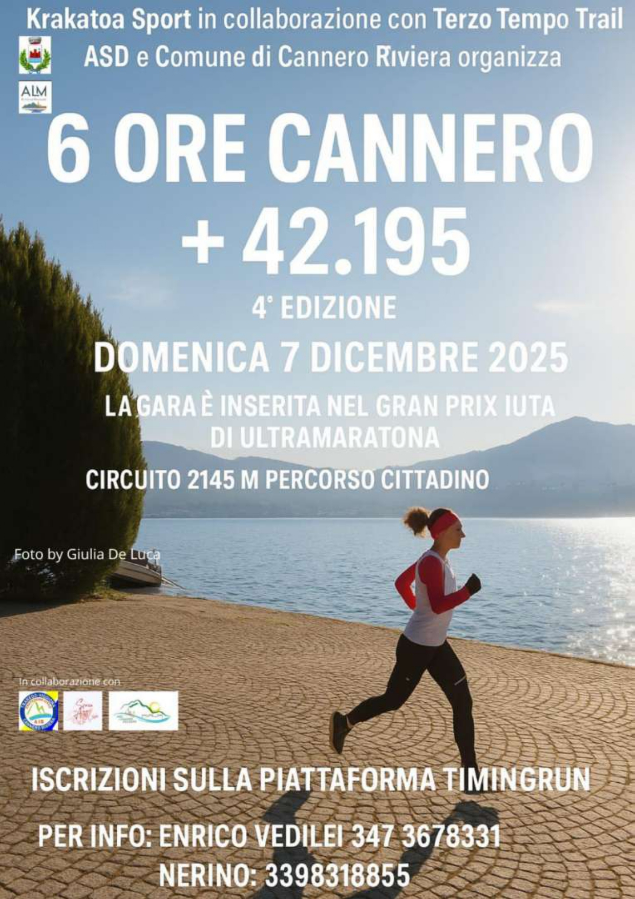 Domenica 7 dicembre 2025 dalle ore 09:00 Cannero Riviera ospiterà la quarta edizione della “CANNERO 6 Ore + 42.195”, manifestazione organizzata da Krakatoa Sport in collaborazione con Terzo Tempo Trail ASD e con il patrocinio del Comune di Cannero Riviera. L’evento propone sia la maratona ufficiale da 42.195 km sia la gara di ultramaratona di 6 ore inserita nel Gran Prix IUTA di Ultramaratona. Le prove si svolgeranno su un circuito cittadino di 2.145 metri, completamente chiuso al traffico e affacciato sul Lago Maggiore: uno dei percorsi più suggestivi del Verbano, che permette agli atleti di correre tra scorci panoramici e un’atmosfera unica della cittadina dell'Alto lago.