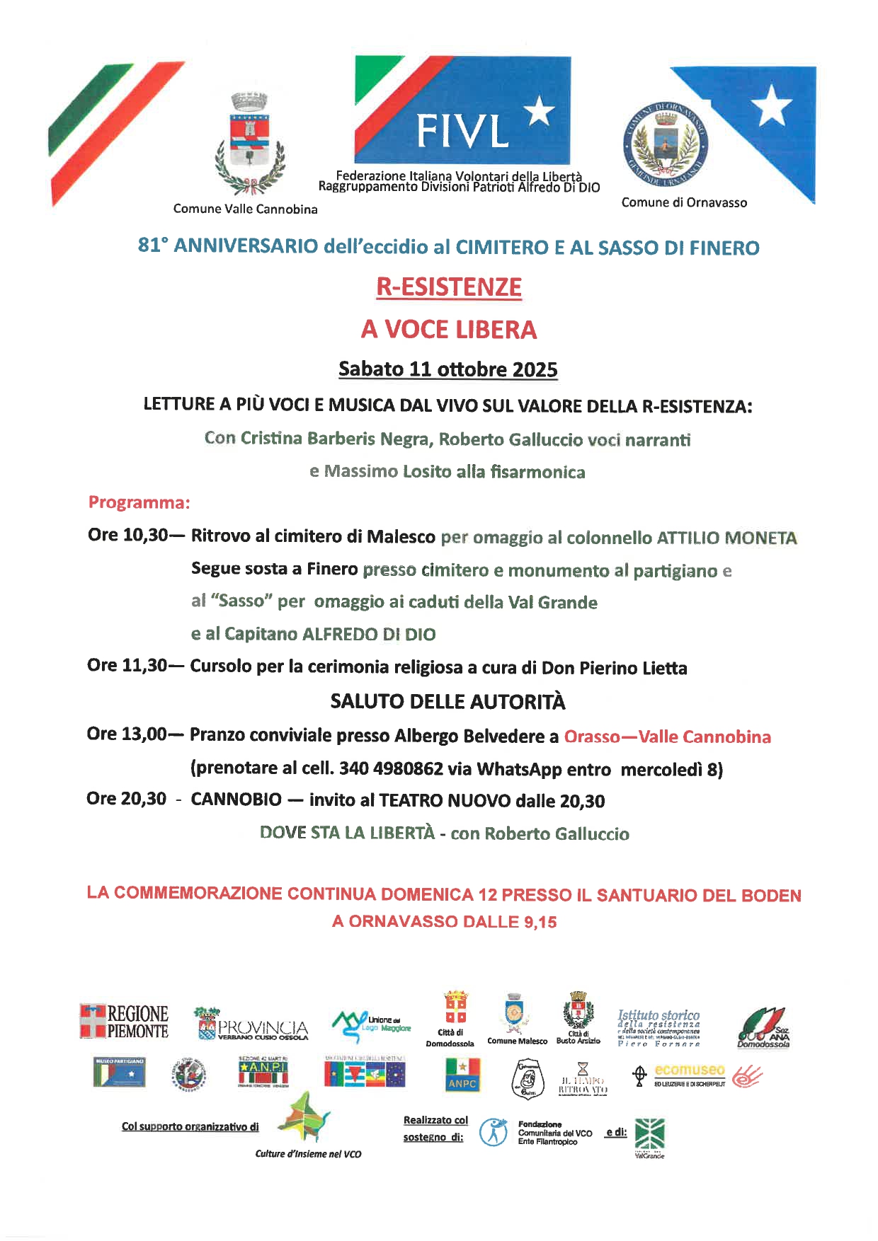 In allegato programma completo della giornata in memoria del 81° anniversario dell’eccidio al cosiddetto “Sasso di Finero” (l’80° dalla Liberazione)