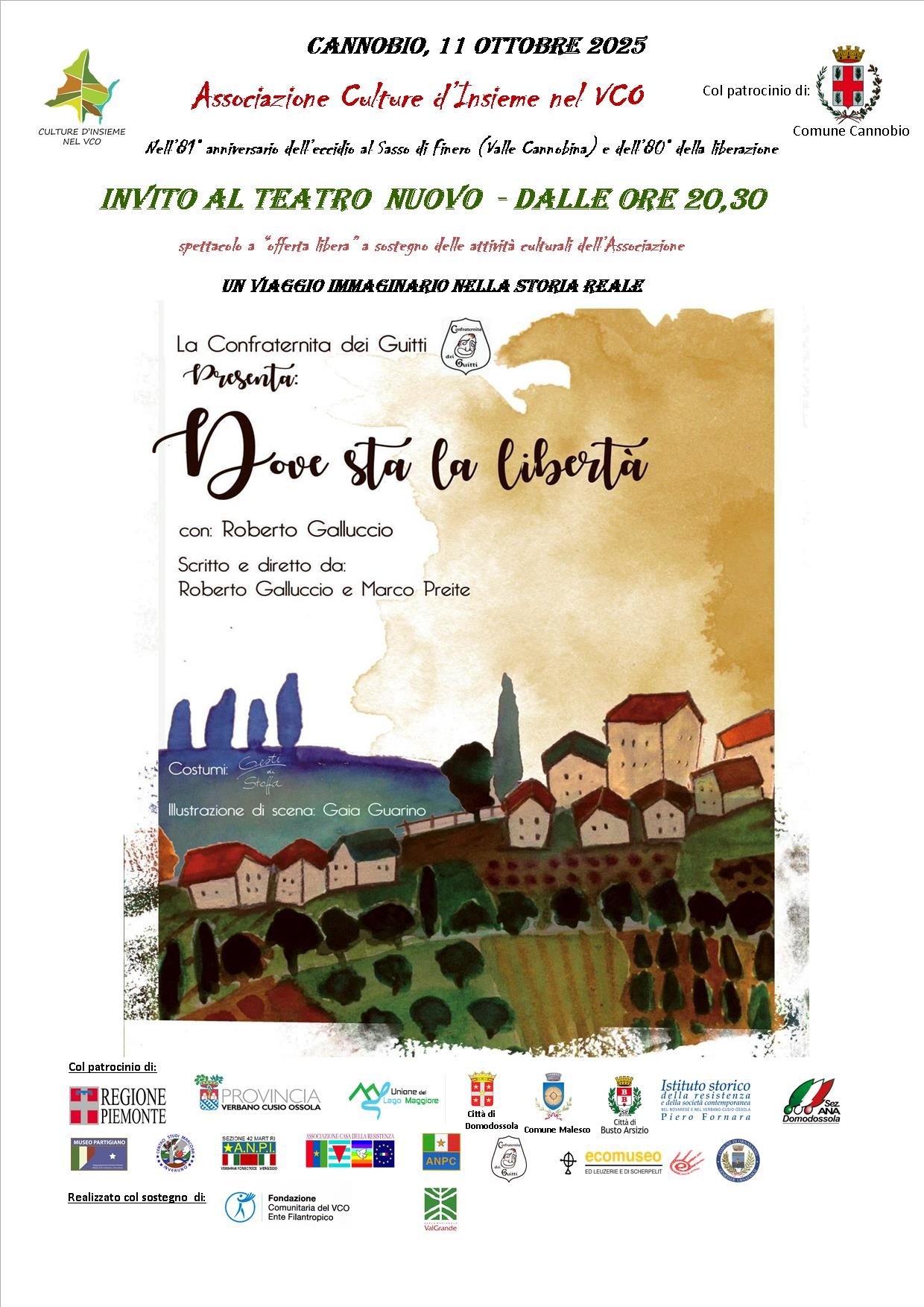 Sabato 11 ottobre dalle ore 20.30 andrà in scena la rievocazione di un pezzo tra i più significativi della storia Cannobina, DOVE STA LA LIBERTA’: atto unico in cinque quadri a cura della Compagnia teatrale la “Confraternita dei Guitti”. E’ la storia di un capocomico che nel 1943 intraprende un viaggio immaginario nella storia reale, dal sud al nord tra Piemonte e Lombardia, alla ricerca della libertà.
