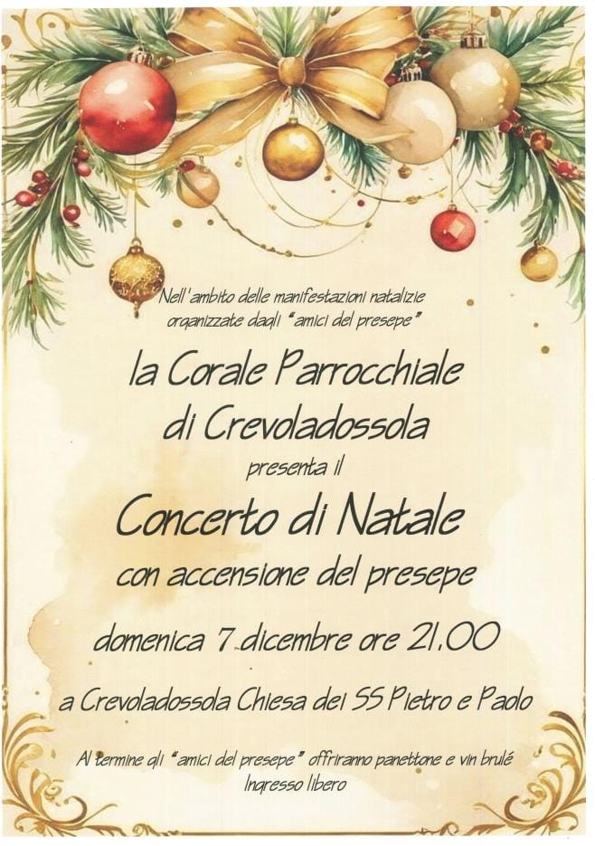 - Domenica 07 dicembre alle ore 21.00 Concerto della Corale di Crevola e inaugurazione/accensione del Presepe presso la Chiesa Parrocchiale dei SS. Pietro e Paolo.