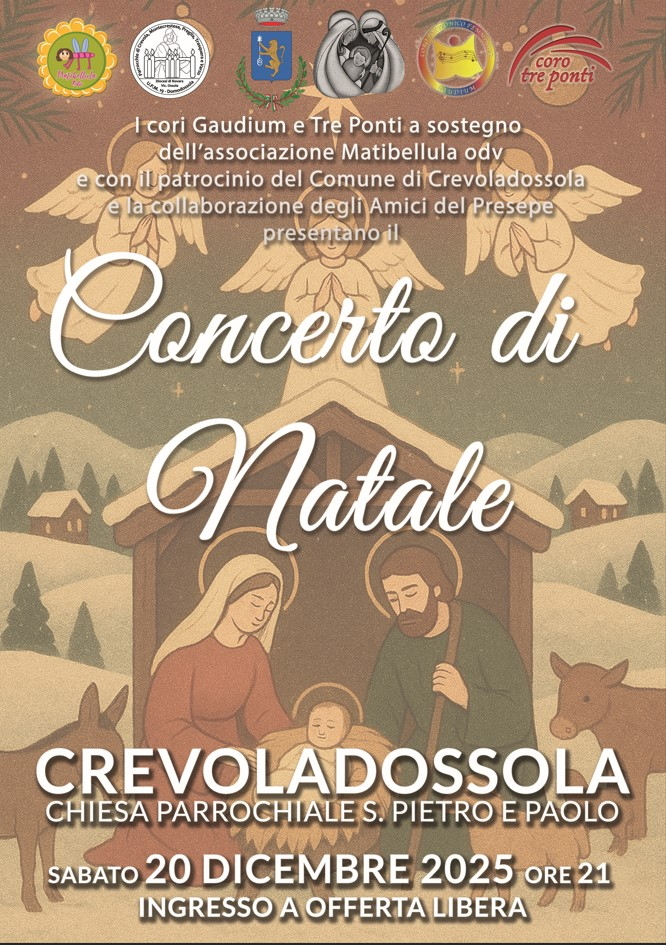 - Sabato 13 dicembre alle ore 21.00 presso la Chiesa dei SS. Pietro e Paolo Concerto del Coro SEO CAI di Domodossola, del Coro Light Voice della Filarmonica di Villadossola e il Coro Gaudium a cura dell’Associazione AmaRene di Verbania.