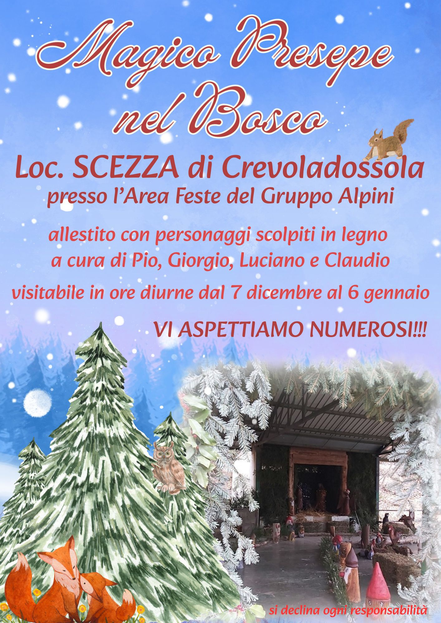 Infine, presepi da visitare dal 7 dicembre al 6 gennaio - Loc. Scezza presso l’Area Feste del Gruppo Alpini – “Magico Presepe nel Bosco” allestito con personaggi scolpiti in legno a cura di Pio, Giorgio, Luciano e Claudio. - Visitabile in ore diurne.