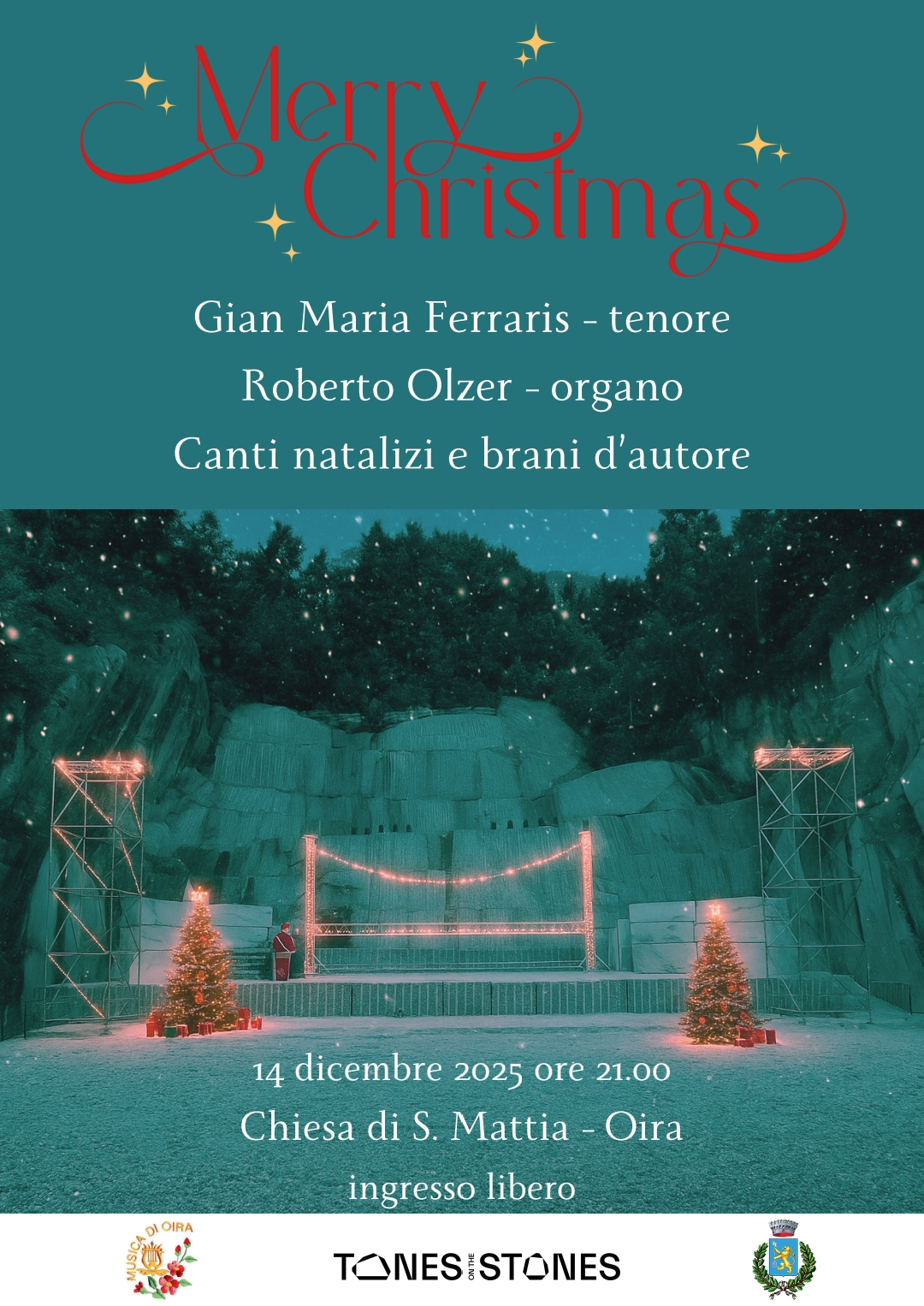 - Domenica 14 dicembre nella frazione Rido alle ore 15.00 accensione delle luminarie e scambio di auguri a seguire dalle ore 15.00 auguri di Natale a Pontemaglio e Oira a cura della Musica di Oira. E alle ore 21.00 presso la Chiesa di S. Mattia a Oira concerto “Merry Christmas” a cura della Fondazione Tones on the Stones con Gian Maria Ferraris (tenore) e Roberto Olzer (organo)