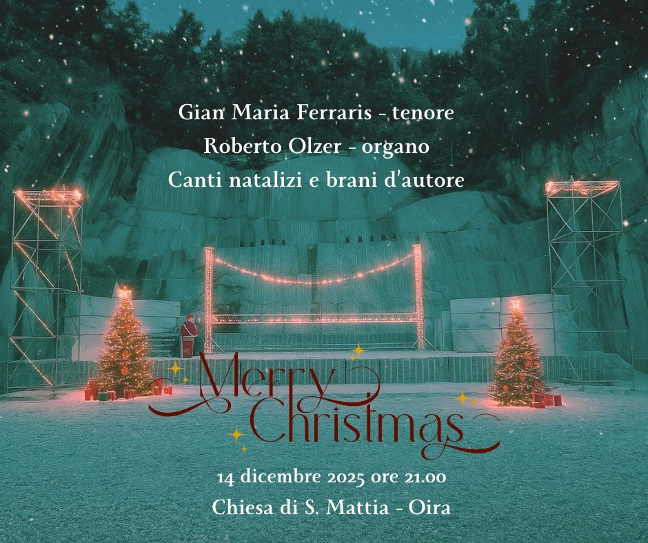 Domenica 14 dicembre alle ore 21.00 presso la Chiesa di S. Mattia a Oira si terrà il concerto “Merry Christmas” a cura della Fondazione Tones on the Stones con Gian Maria Ferraris (tenore) e Roberto Olzer (organo).