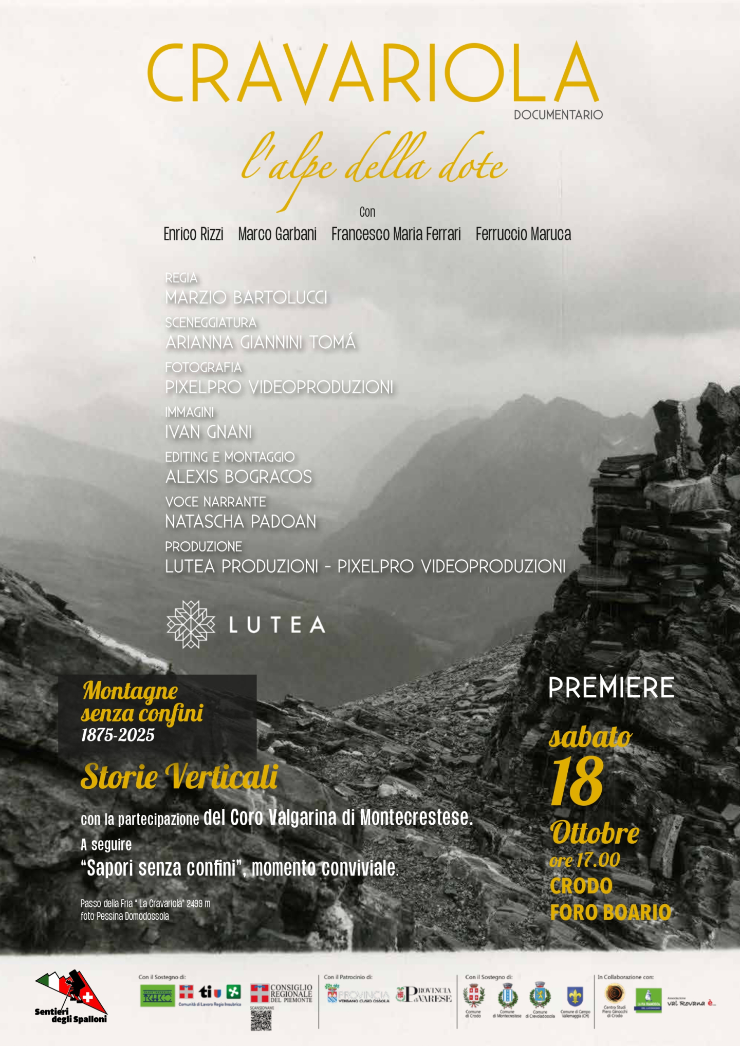 Sabato 18 ottobre alle ore 17.00 si terrà  presso il Foro Boario la prima visione assoluta del documentario "CRAVARIOLA: l'Alpe della Dote", un evento di punta del programma 2025 "Montagne senza Confini", dedicato al 150° anniversario della posa dei cippi di confine tra Italia e Svizzera. La serata vedrà anche la presenza delle voci del Coro Valgarina di Montecrestese. Dopo la visione, sarà possibile gustare “Sapori senza confini”, uno spazio di assaggi di sapori e bontà del territorio.