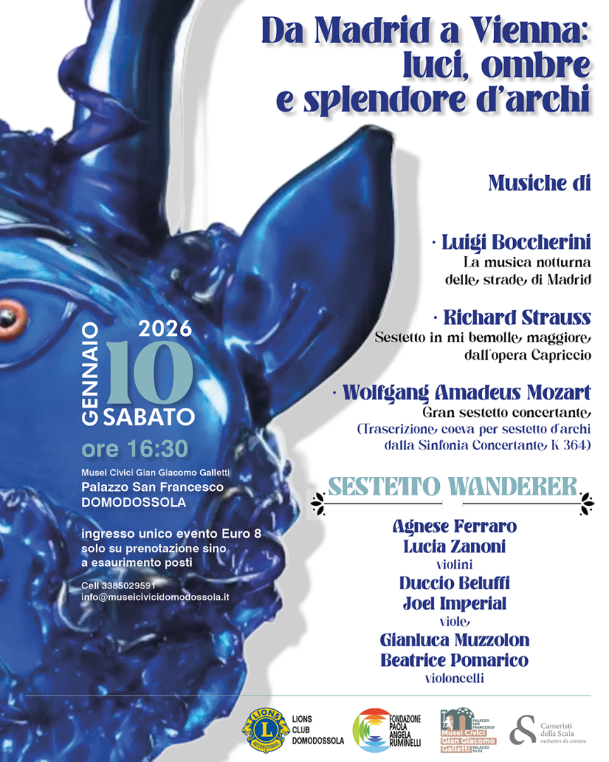Sabato 10 gennaio la stagione 2026 dell'Associazione Culturale Mario Ruminelli inizia con il concerto “Da Madrid a Vienna: luci, ombre e splendore d’archi”, in programma alle ore 16,30 a Palazzo San Francesco a Domodossola. Protagonista il Sestetto Wanderer, che eseguirà musiche di Luigi Boccherini, Richard Strauss e Wolfgang Amadeus Mozart; l'evento è realizzato grazie alla collaborazione tra Lions Club Domodossola e Fondazione Paola Angela Ruminelli. Il Sestetto Wanderer nasce dall’incontro di sei professori dell’Orchestra del Teatro alla Scala di Milano accomunati da una solida formazione cameristica e da una profonda affinità artistica: Agnese Ferraro e Lucia Zanoni ai violini, Duccio Beluffi e Joel Imperial alle viole, Gianluca Muzzolon e Beatrice Pomarico ai violoncelli danno vita a un organico che trova nel repertorio per sestetto d’archi uno spazio privilegiato di ricerca ed espressione.