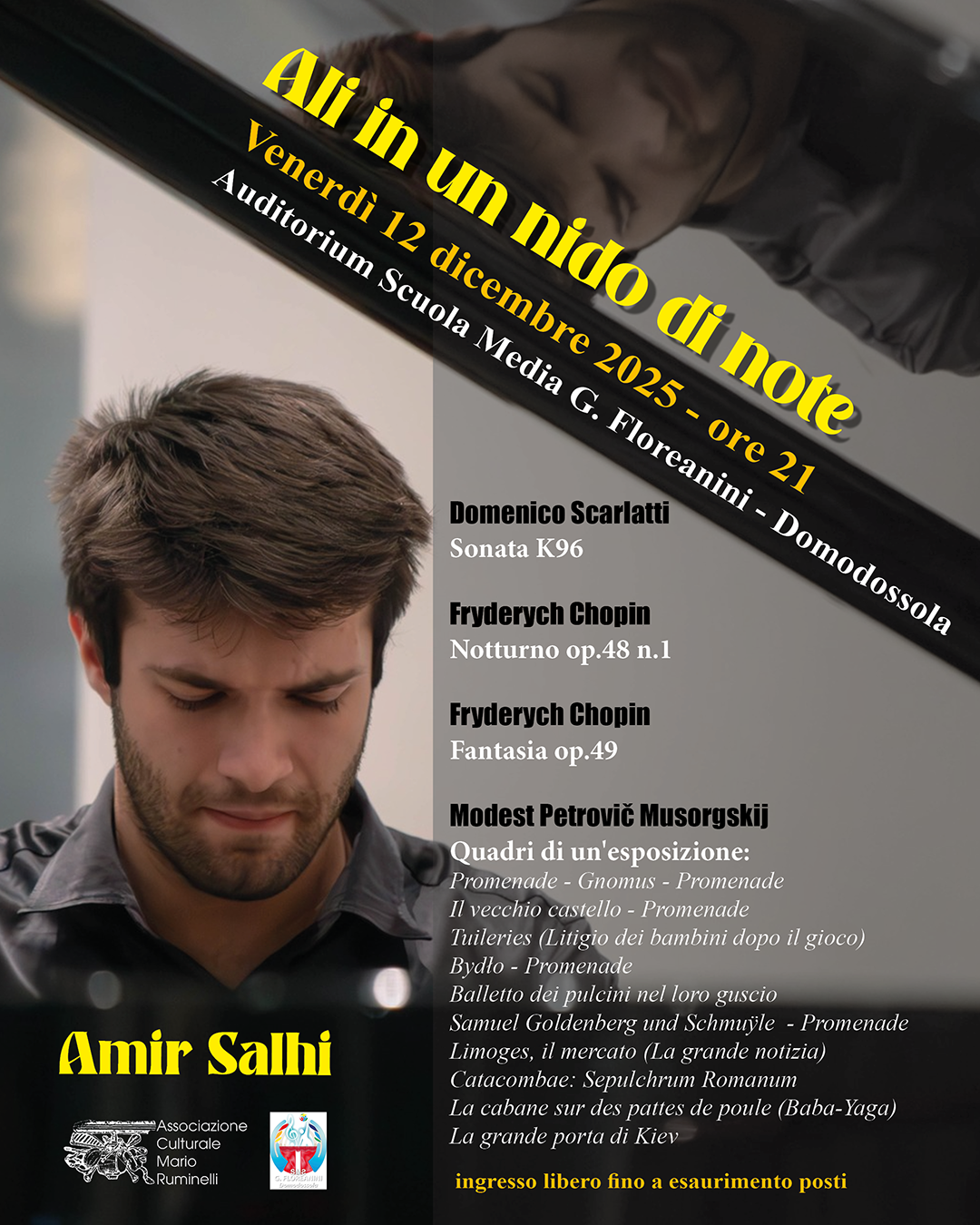 Venerdì 12 dicembre alle ore 21:00 presso l'Auditorium della Scuola Media G. Floreanini di Domodossola è in programma il concerto del giovane e talentuoso pianista domese Amir Salhi. “Ali in un nido di note” è il titolo della serata, che ha in repertorio brani di Chopin, Scarlatti e Musorgskij; il programma riunisce tre universi musicali apparentemente lontani, legati però dallo stesso filo conduttore: la forza immaginifica del pianoforte come strumento narrativo. Brani che suonati nello stesso contesto mostrano come, in epoche e stili diversi, il pianoforte abbia saputo trasformarsi in un narratore capace di creare mondi, immagini e storie attraverso il puro linguaggio dei suoni.