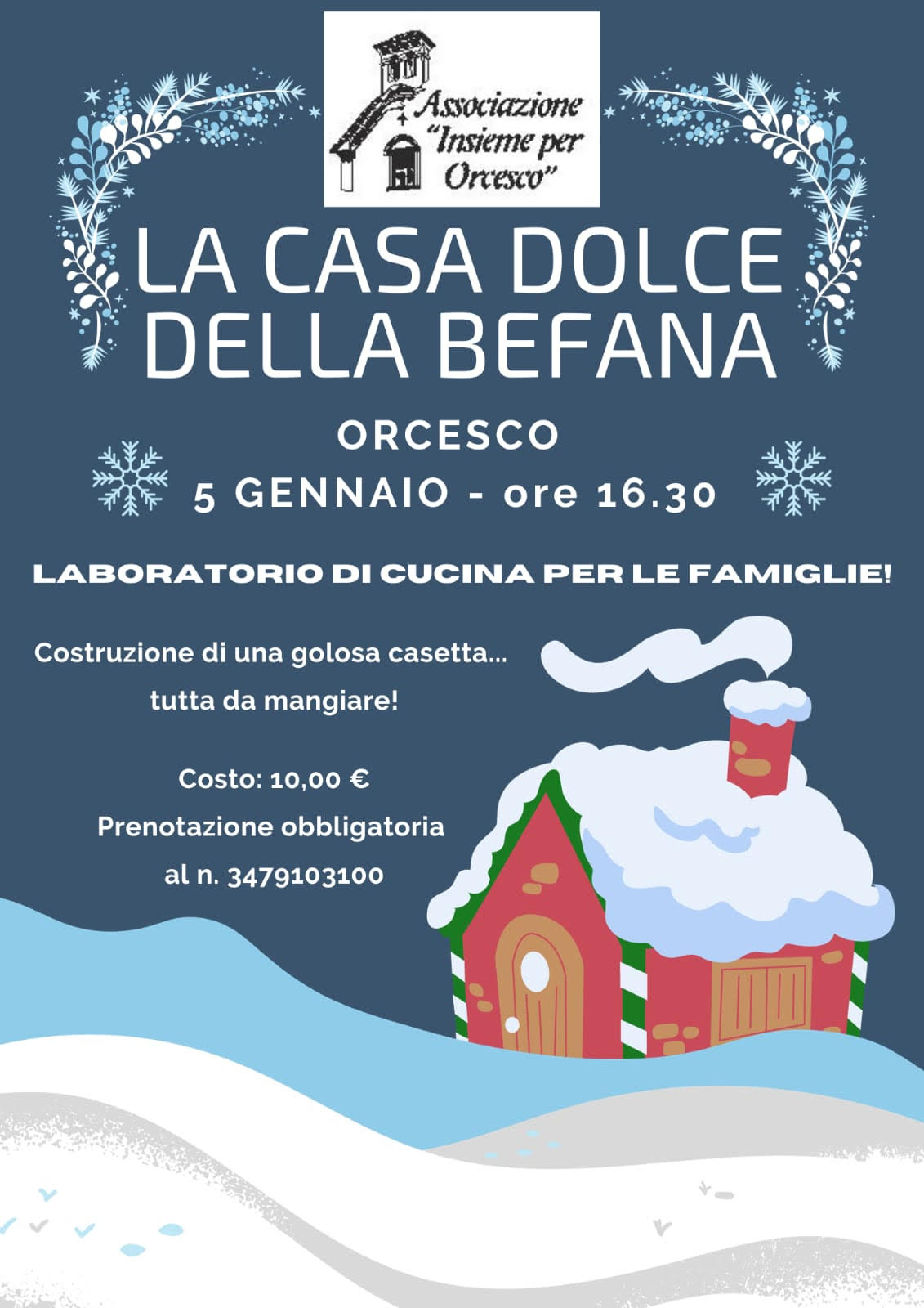 Venerdì 5 Gennaio 2024 alle ore 16.30 presso sala comunale a Orcesco (VB) si terrà La Casa Dolce della Befana con laboratorio di cucina per le famiglie e costruzione di una golosa casetta…tutta da mangiare!