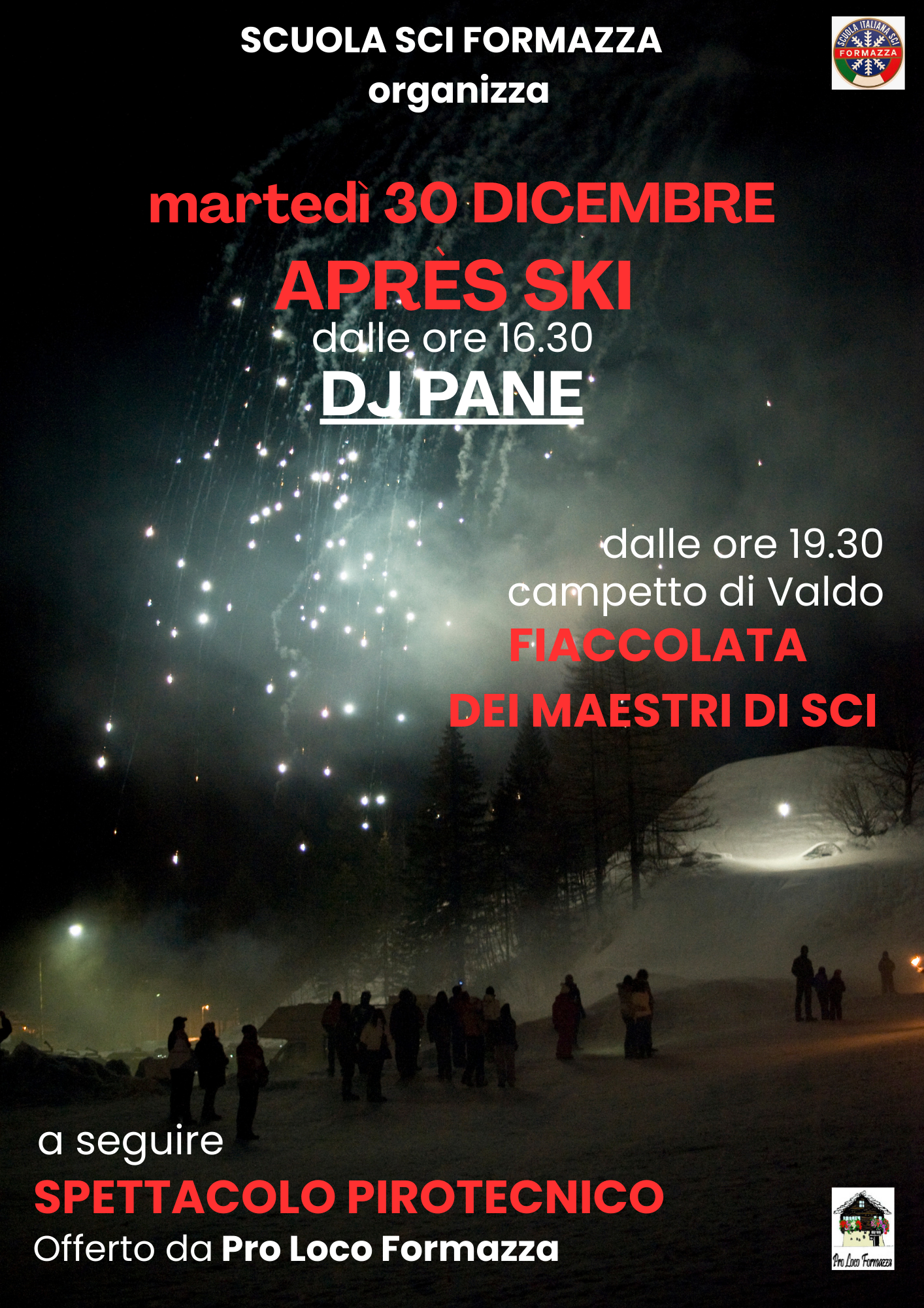 A partire dalle ore 16.30 Aprè Ski con dj Pane e dalle 19.30 partirà la suggestiva fiaccolata sulla pista di Valdo ed a conclusione dell'evento ci sarà uno speciale spettacolo di fuochi d'artificio offerto dalla Pro Loco Formazza.