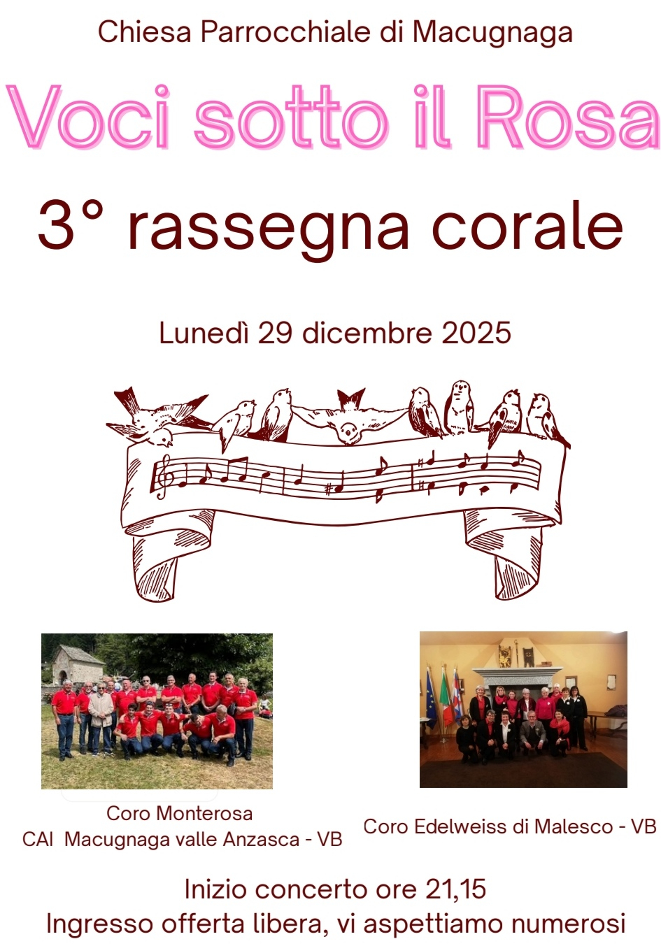 Concerto di Natale del 29/12/2025 - h. 21:15 - Chiesa Parrocchiale di Macugnaga. Terza serata della rassegna "Voci sotto il Rosa" Coro Monterosa CAI Macugnaga e Valle Anzasca con ospite il Coro Edelweiss di Malesco.