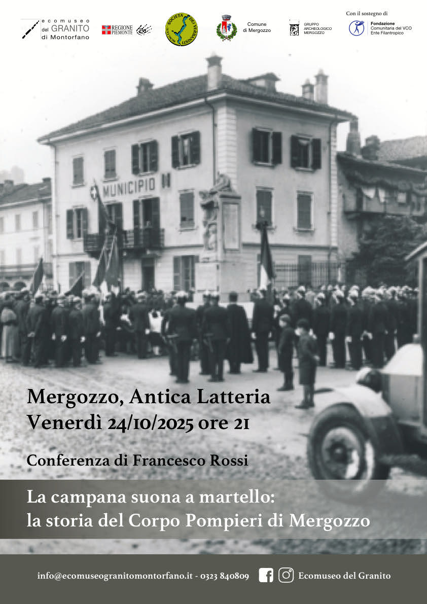 Venerdì 24 ottobre alle ore 21:00 presso la sala conferenze Antica Latteria a Mergozzo l’Ecomuseo del Granito con la collaborazione della Società dei Verbanisti propone la conferenza di Francesco Rossi dedicata a presentare la storia del Corpo dei Pompieri di Mergozzo con "La campana suona a martello: la storia del Corpo Pompieri di Mergozzo".