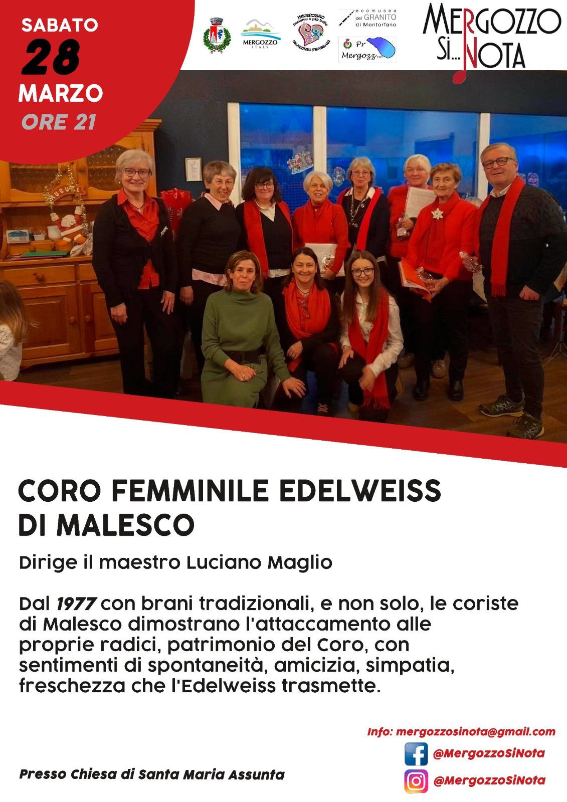Mergozzo si prepara ad accogliere una serata all'insegna della musica e delle tradizioni con il concerto del Coro femminile Edelweiss di Malesco, inserito nel calendario di Mergozzo Si Nota. Dal 1977 con brani tradizionali, e non solo, le coriste di Malesco dimostrano l'attaccamento alle proprie radici, patrimonio del Coro, con sentimenti di spontaneità, amicizia, simpatia, freschezza che l'Edelweiss trasmette.
