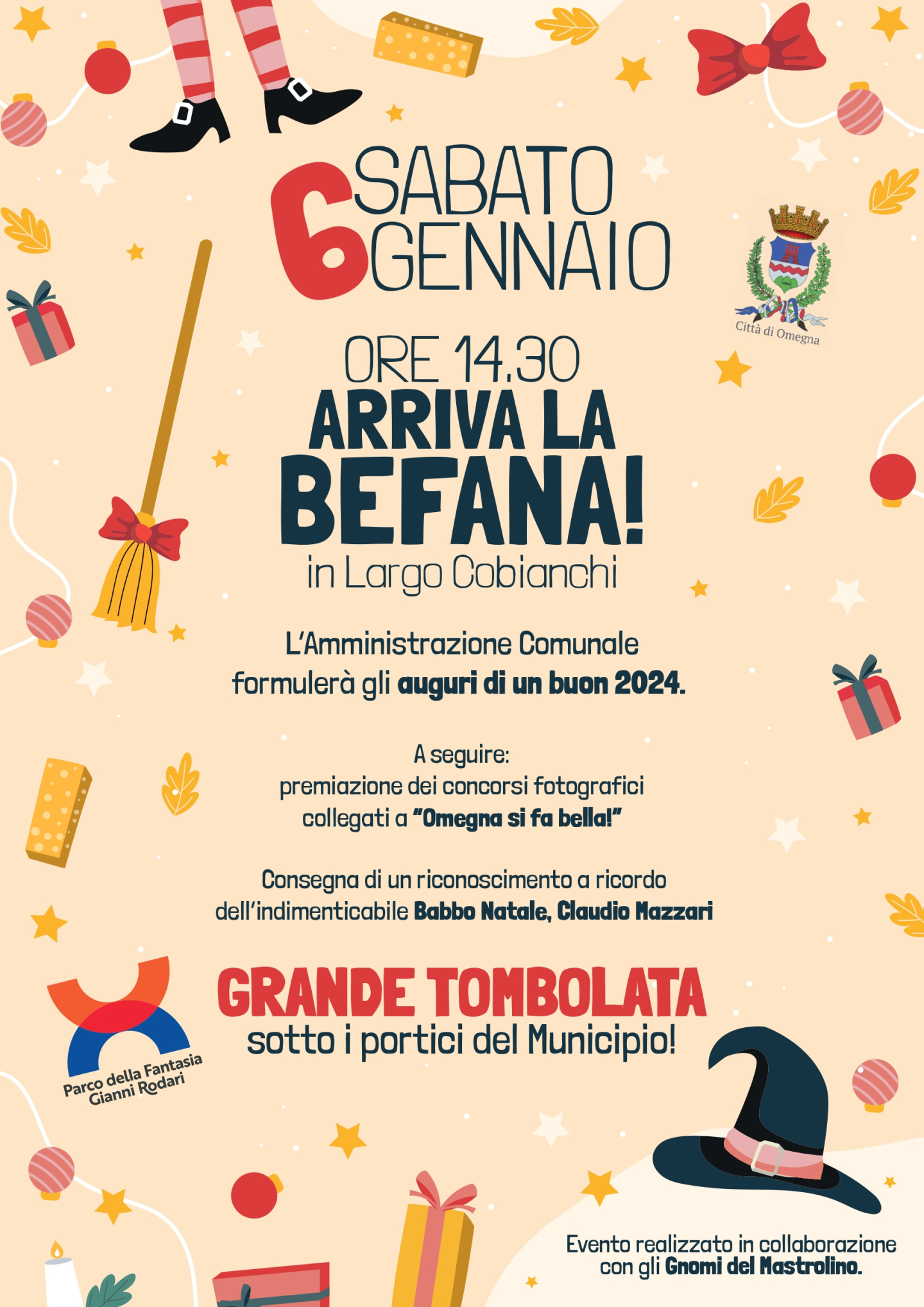 Sabato 6 gennaio alle ore 14:30 ci sarà l'Arrivo della Befana. L'Amministrazione Comunale formulerà gli auguri di un buon 2024 e si procederà con la premiazione dei concorsi fotografici collegati a “Omegna si fa bella!”. A seguire, prima dell’inizio della grande tombolata sotto il municipio, la Città di Omegna consegnerà un riconoscimento a ricordo dell’indimenticabile Babbo Natale, Claudio Mazzari, scomparso poche settimane fa.