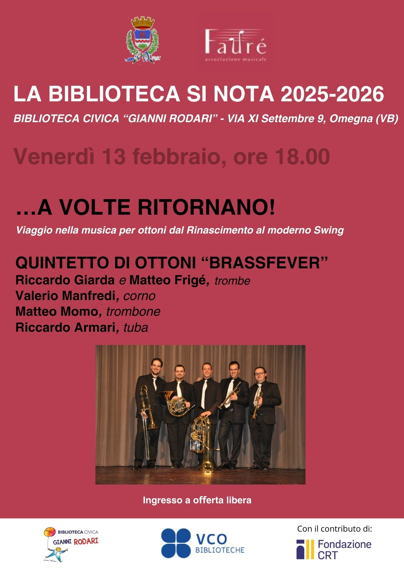 Torna in scena La biblioteca si nota con un nuovo appuntamento: ...A volte ritornano - viaggio nella musica degli ottoni: un concerto del quintetto di ottoni "Brassfever", Riccardo Giarda e Matteo Frigè (tromba), Valerio Manfredi (corno), Matteo Momo (trombone) e Riccardo Armari (tuba). Ci presenteranno un repertorio che abbraccia generi diversi, valorizzando la musica originale per quintetto di ottoni.