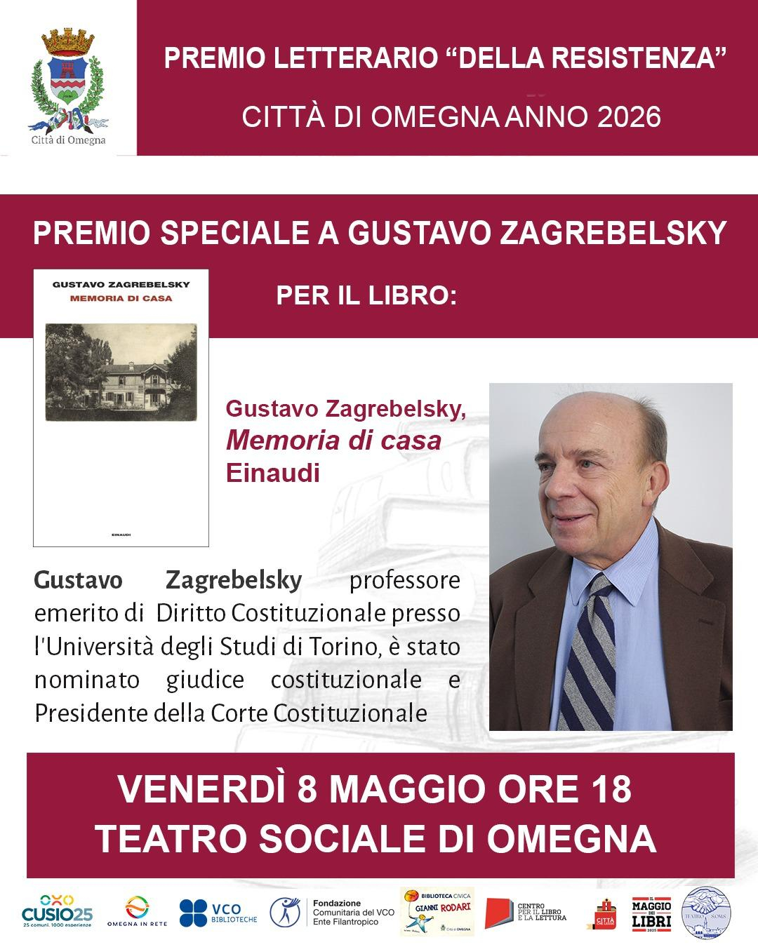 Venerdì 8 maggio alle ore 18:00 si terrà il premio letterario "Della Resistenza" con premio speciale a Gustavo Zagrebelsky per il libro Memoria di casa Einaudi.