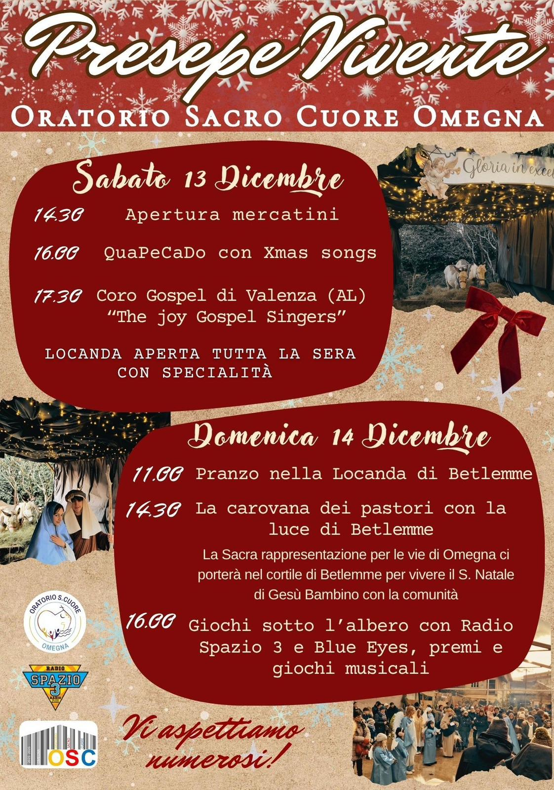 Mentre domenica 14 dicembre dalle ore 11:00 pranzo nella Locanda di Betlemme, a seguire alle ore 14:30 Carovana dei pastori con la Sacra rappresentazione per le vie di Omegna. Si conclude la giornata alla ore 16.00 con i giochi sotto l'albere con Radio Spazio 3 e Ble Eyes, premi e giochi musicali!
