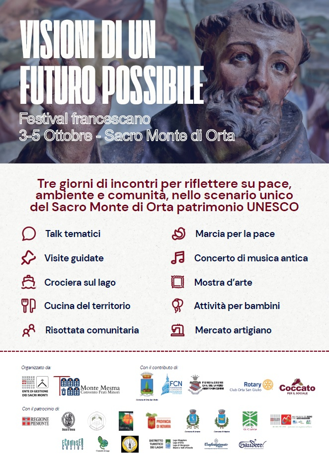 Dal 3 al 5 ottobre 2025 il Sacro Monte di Orta ospiterà la prima edizione di Visioni di un futuro possibile, nuovo festival francescano che mette al centro i grandi temi della pace, dell’ambiente e della comunità. Tre giorni di incontri, testimonianze e momenti di condivisione in un luogo che porta in sé il messaggio universale di San Francesco d’Assisi e che si propone di diventare un appuntamento annuale di alto profilo, capace di unire cultura e attualità. Tutti gli appuntamenti sono a ingresso libero.