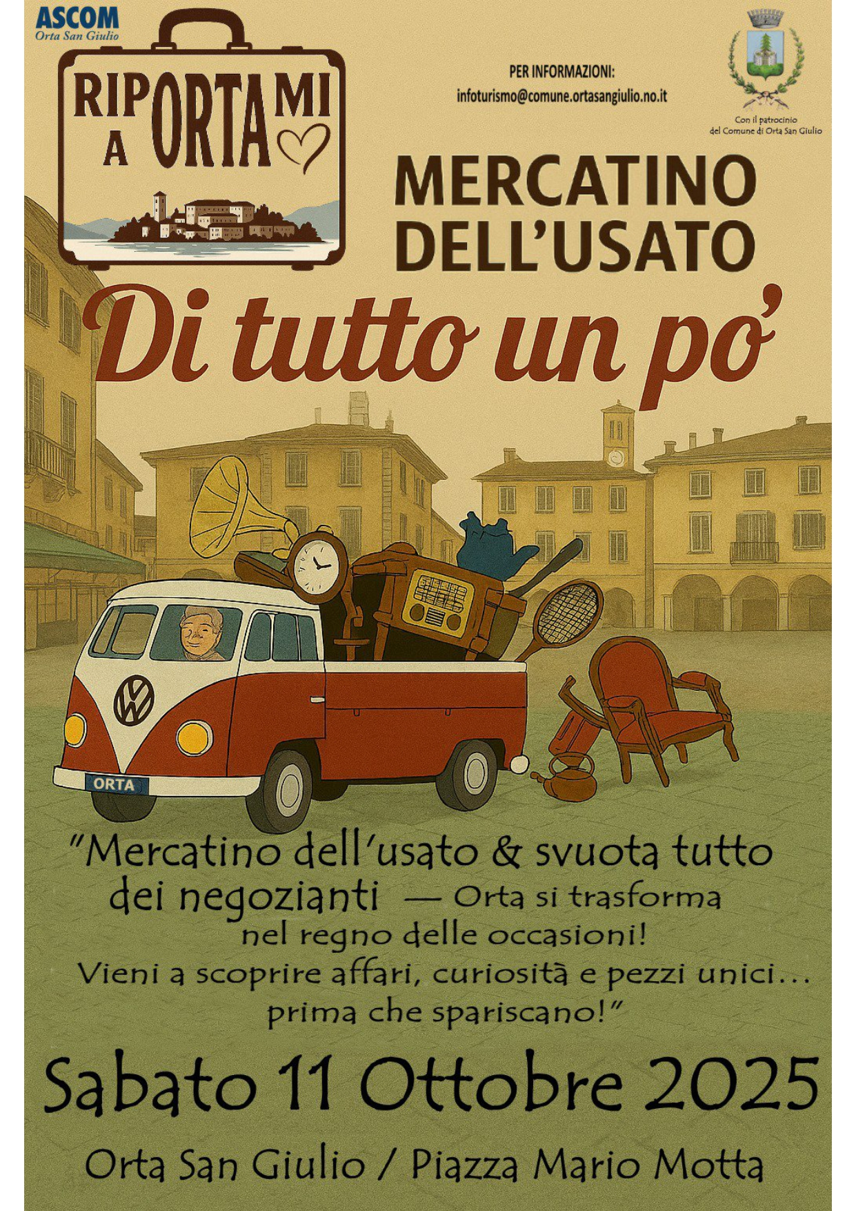 Sabato 11 ottobre si svolgerà il mercatino dell’usato e svuota tutto dei negozianti. Orta San Giulio si trasforma nel regno delle occasioni con affari, curiosità e pezzi unici.