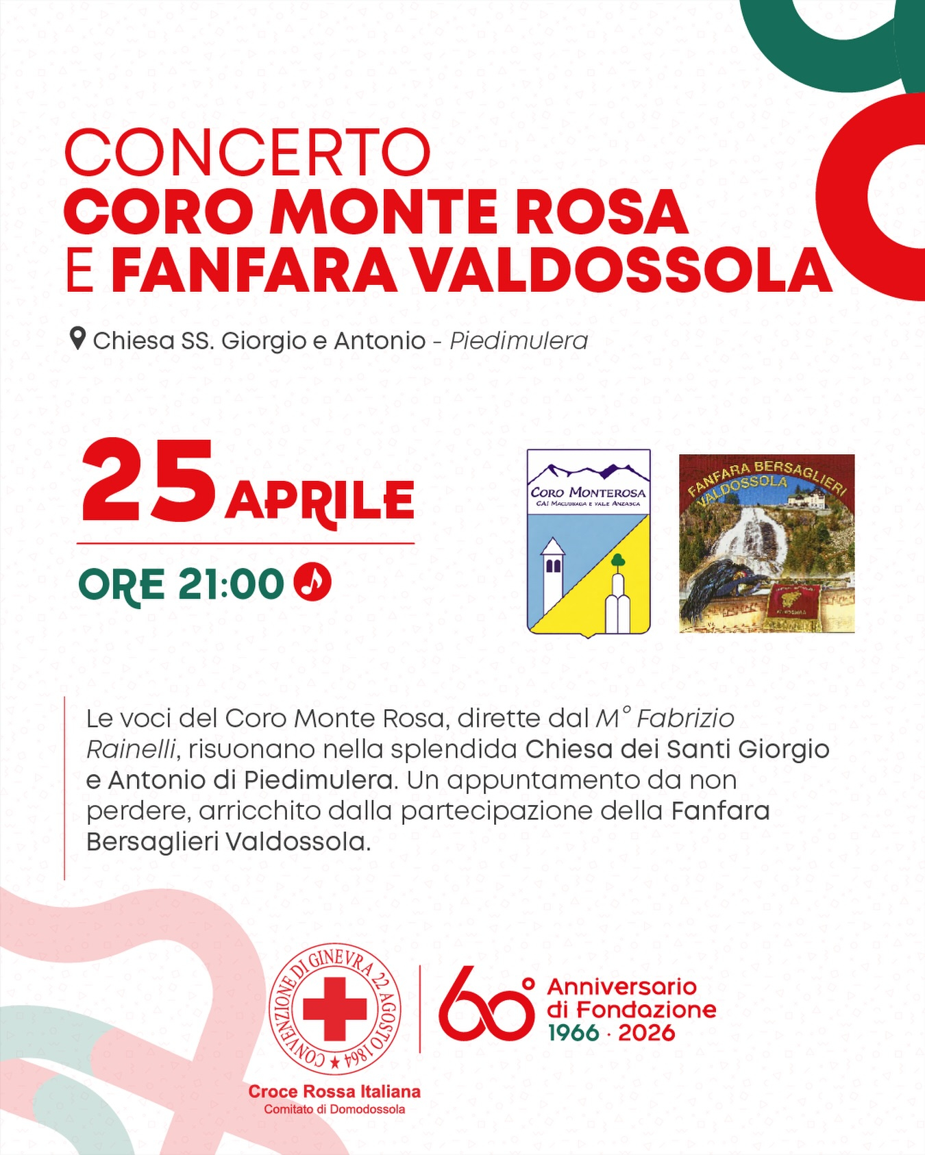 Sabato 25 aprile alle ore 21:00 si terrà il Concerto Coro Monte Rosa e Fanfara Valdossola.