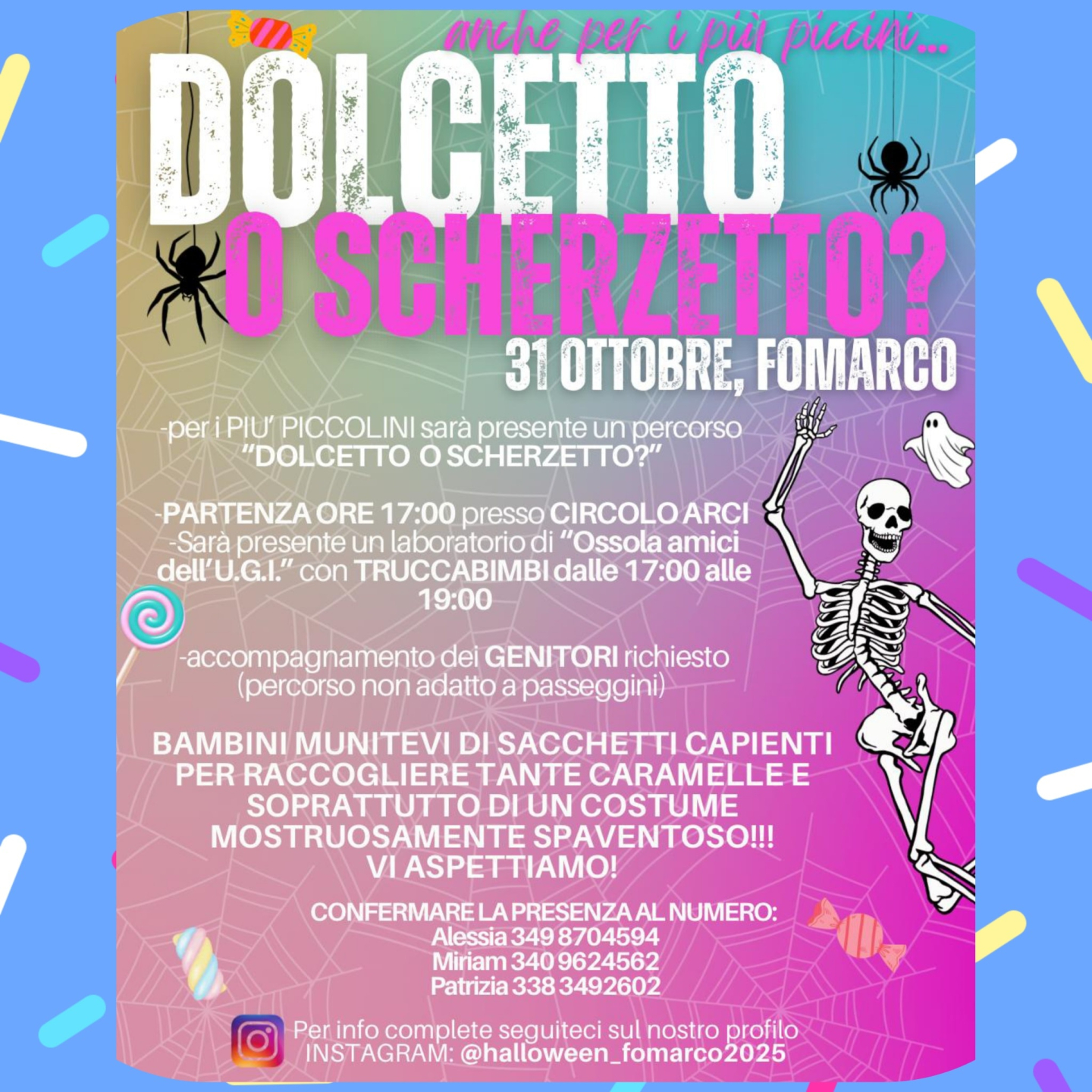 Dalle 17.00 per i più piccoli percorso "DOLCETTO O SCHERZETTO"  partenza dal Circolo ARCI (accompagnamento dei genitori richiesto) TRUCCABIMBI e LABORATORIO CREATIVO a cura dell'associazione Ossola Amica Dell'UGI ODV.