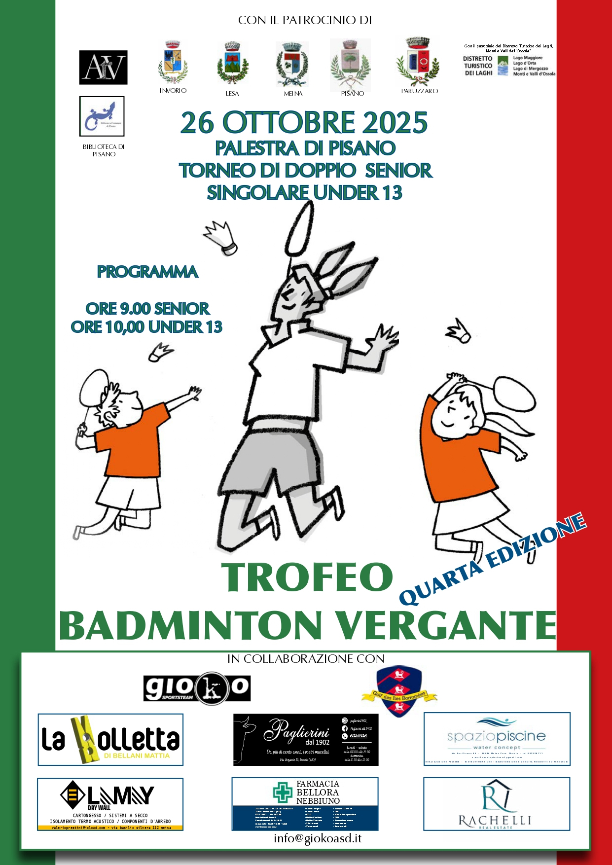 Domenica 26 ottobre si terrà la quarta prova del TROFEO BADMINTON VERGANTE che si svolgerà a Pisano.