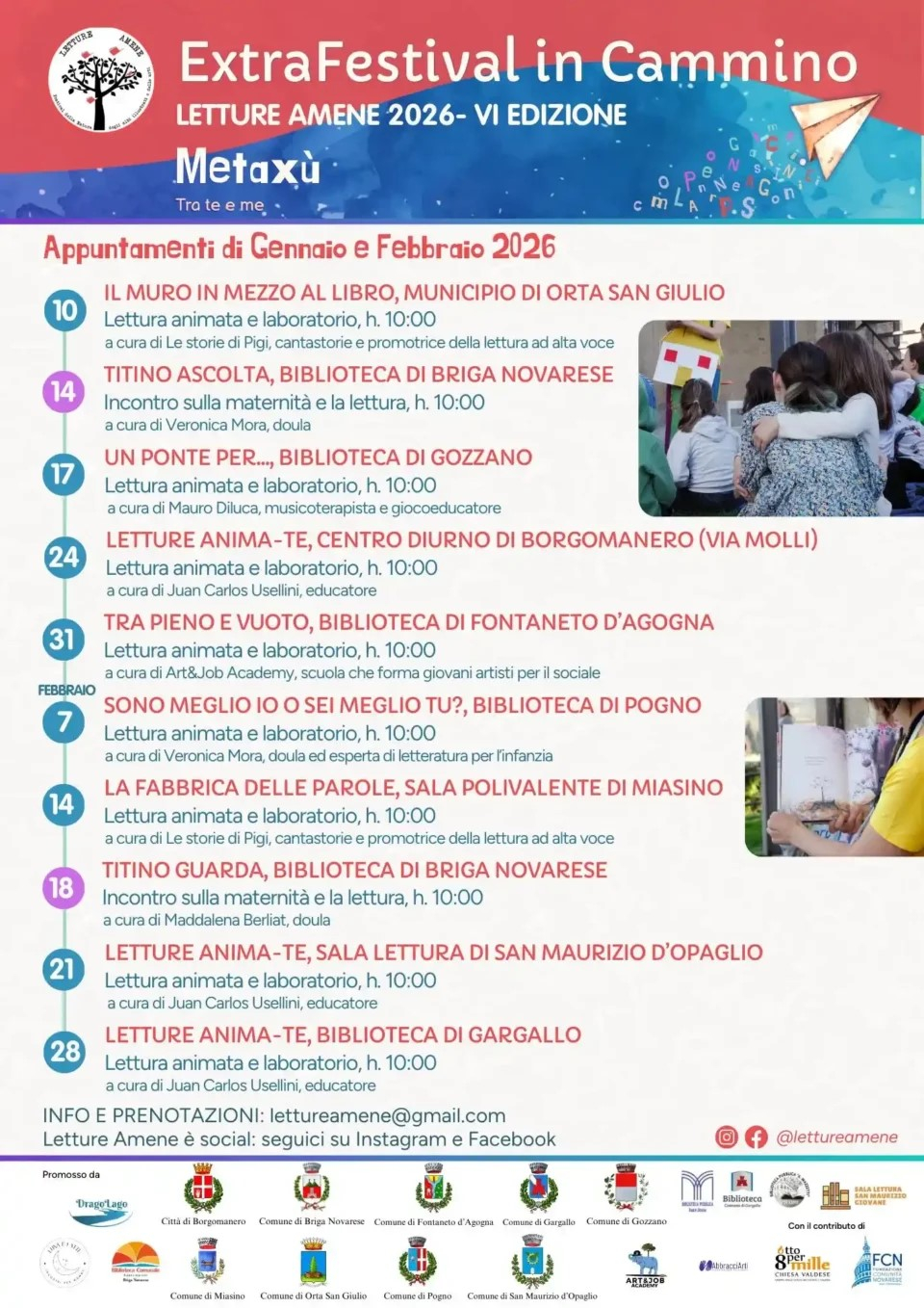 Vari appuntamenti, distribuiti tra i comuni dell’Alto Novarese e del Cusio per accompagnare bambini, famiglie ed educatori alla scoperta di "metaxù" - lo spazio "tra" che non separa ma unisce - attraverso albi illustrati, momenti di formazione, laboratori creativi e interattivi.