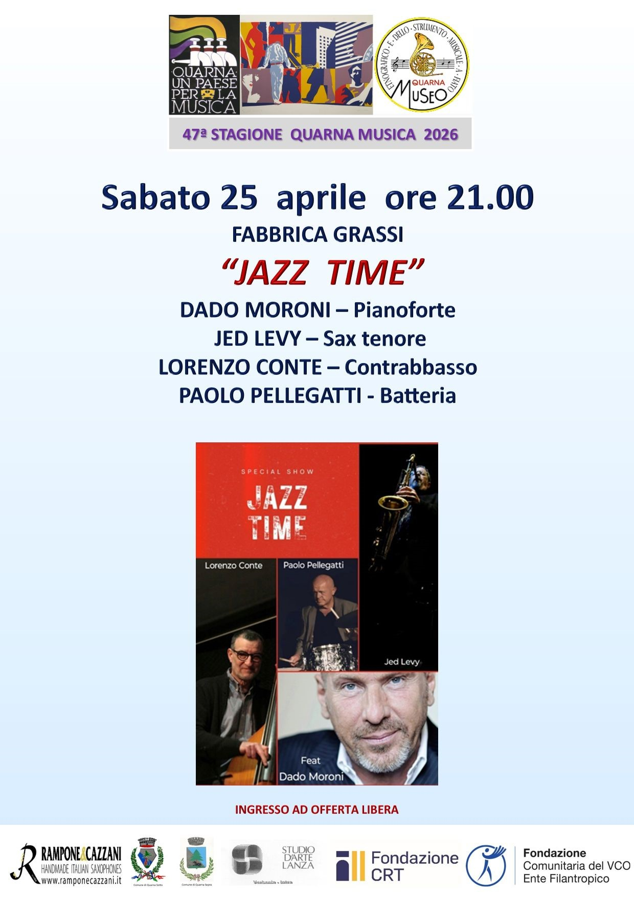 Sabato 25 aprile alle ore 21.00 si terrà il concerto “JAZZ TIME”