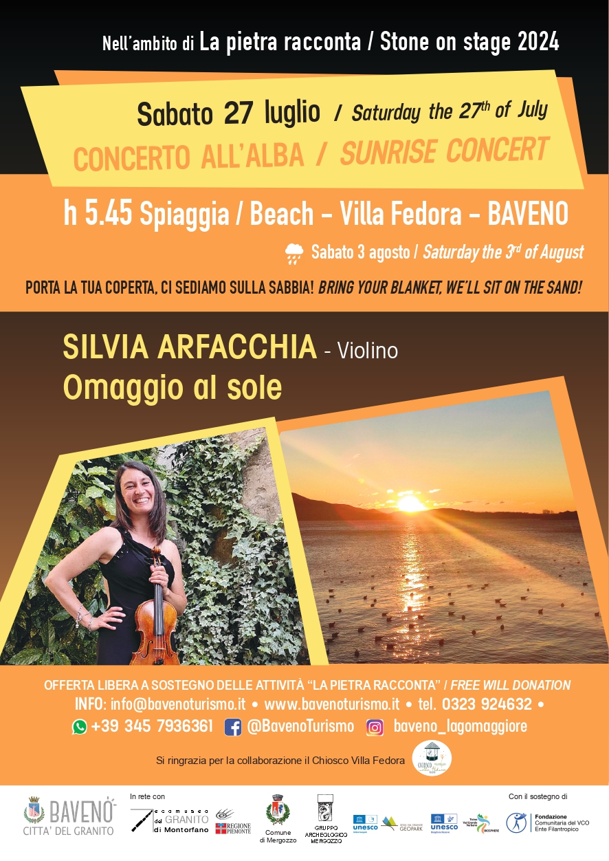 Il programma per violino solo alterna brani del repertorio classico ad altri più moderni. Partecipazione a offerta libera in sostegno delle attività proposte dalla rassegna “La pietra racconta 2024”, realizzata in collaborazione da Città di Baveno, Comune di Mergozzo e GAM con il sostegno di Fondazione Comunitaria VCO.