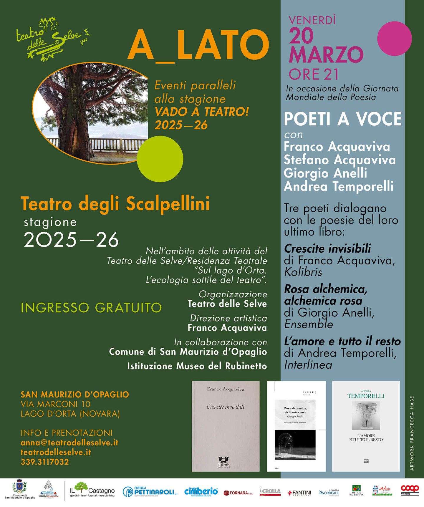 Franco Acquaviva con il suo Crescite invisibili appena pubblicato da Kolibris, sarà insieme ai poeti Andrea Temporelli (L'amore e tutto il resto, Interlinea) e Giorgio Anelli, (Rosa alchemica, alchemica rosa, Ensemble), ciascuno cogliendo poesie dal proprio ultimo libro, mentre Stefano Acquaviva presenterà la sua poesia di suoni.