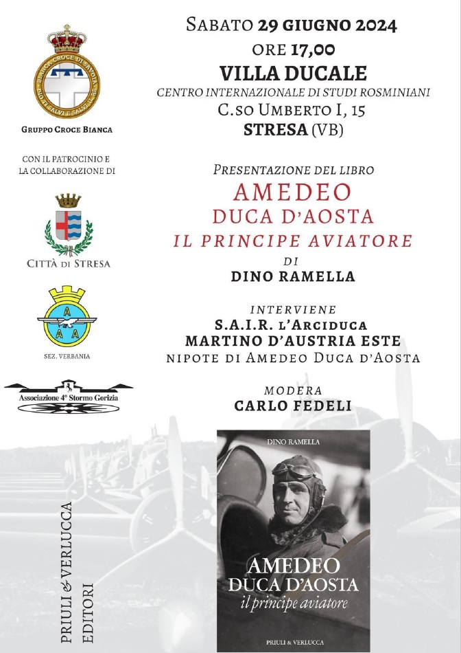 Alle ore 17 di sabato 29 giugno 2024 presso la Villa Ducale, sede del Centro Internazionale di Studi Rosminiani si terrà la presentazione del nuovo libro dell’autore torinese Dino Ramella “Amedeo Duca d’Aosta il principe aviatore”, pubblicato da Priuli & Verlucca Editori, Strambino. Dialogheranno con l’Autore Sua Altezza Imperiale Reale l’Arciduca Martino d’Austria Este, nipote del principe aviatore e del Beato Carlo di Asburgo, e il moderatore dell’evento Carlo Fedeli, il cui nonno Comandante della Regia Aeronautica fu tra gli stretti collaboratori del principe sabaudo.