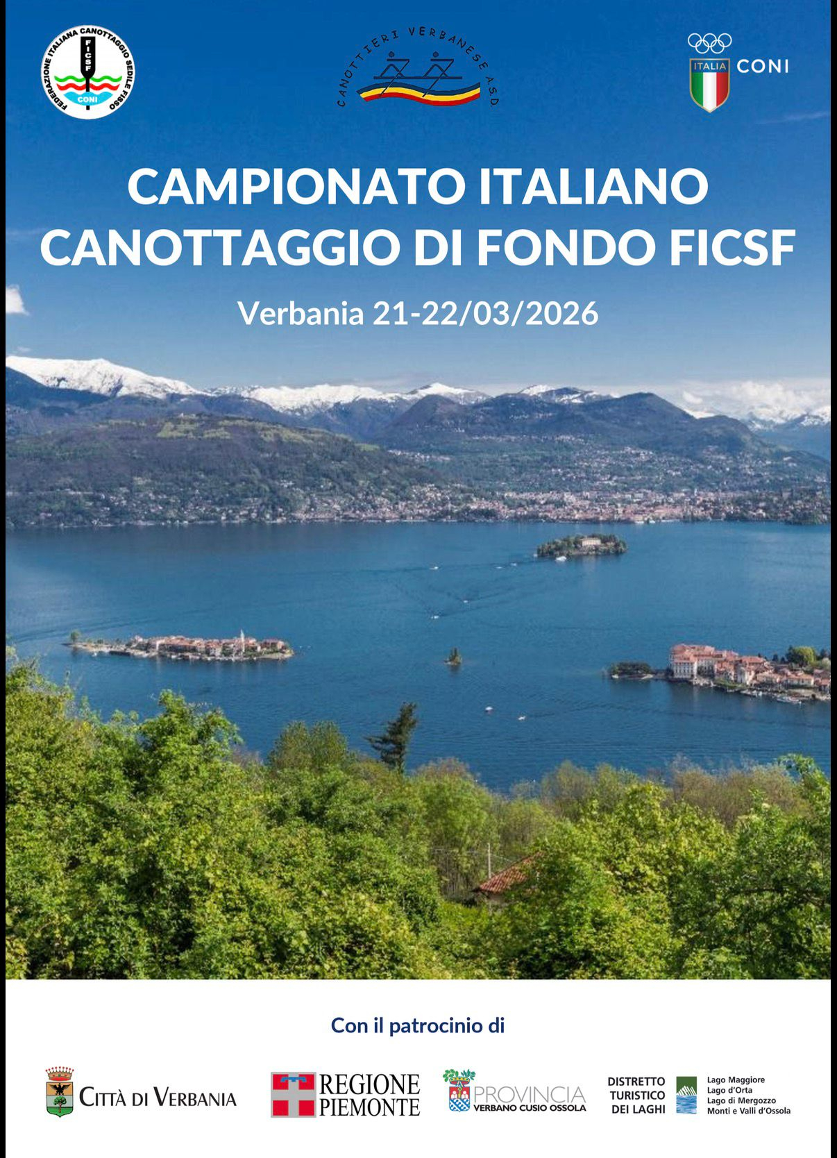 Sabato 21 e domenica 22 marzo 2026 dalle ore 10:00 alle ore 18:00 si terrà il Campionato Italiano di Canottaggio a sedile fisso di Fondo Dicsf sulle acque del Lago Maggiore in un contesto spettacolare a Verbania Pallanza con base Piazza Garibaldi.