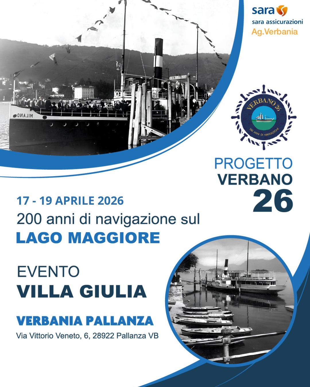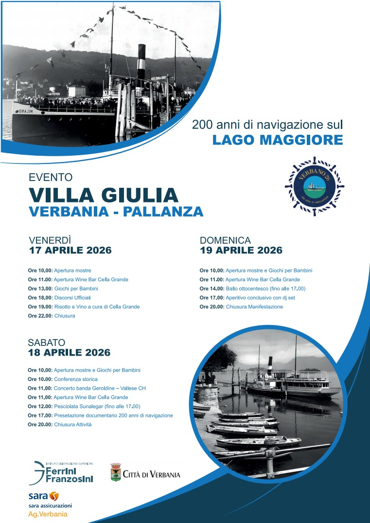 Dal 17 al 19 aprile 2026, la splendida cornice di Villa Giulia ospiterà tre giorni di festa aperti al pubblico per celebrare i 200 anni della navigazione sul Lago Maggiore. L’iniziativa è promossa da Verbano 26 in collaborazione con il Comune di Verbania, l’Istituto Ferrini Franzosini, Cella Grande, la Società di Danza di Novara e Sunalegar.