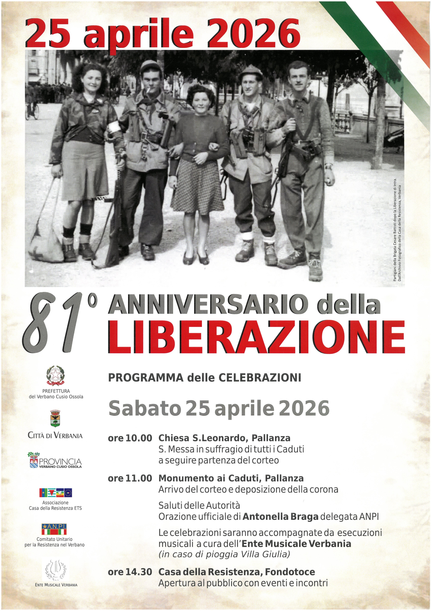 ore 11: Monumento ai Caduti (Lungolago Pallanza). Arrivo del corteo e deposizione della corona; Saluti delle Autorità; Orazione ufficiale di Antonella Braga, delegata ANPI. Le celebrazioni saranno accompagnate da esecuzioni musicali a cura dell'Ente Musicale Verbania