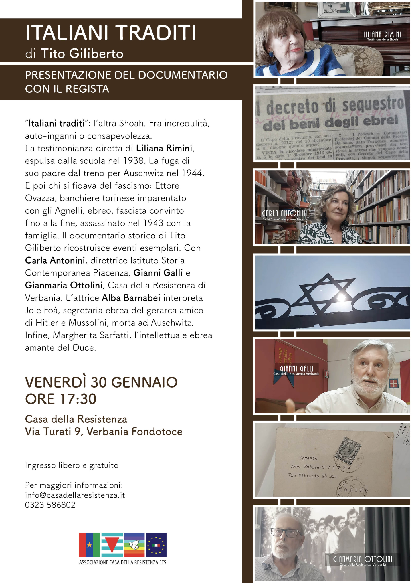 “Italiani traditi”: l’altra Shoah. Il docu-film di Tito Giliberto debutta venerdì 30/1 alle ore 17.30 alla Casa della Resistenza a Verbania (via Turati 9, Fondotoce). Una prospettiva inconsueta. Si tocca il tema arduo di ebrei fascisti assassinati nella persecuzione razziale. Fra inganni, autoinganni o consapevolezza.