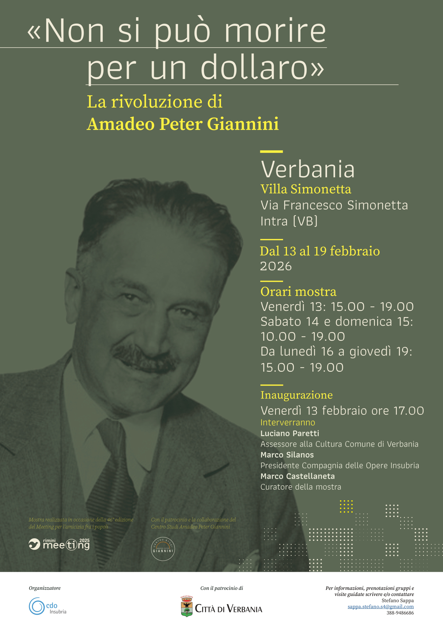 L’inaugurazione è prevista per venerdì 13 febbraio alle ore 17.00, con gli interventi di Luciano Paretti, Assessore alla Cultura del Comune di Verbania, Marco Silanos, Presidente di Associazione Compagnia delle Opere Insubria e Marco Castellaneta, curatore della mostra.