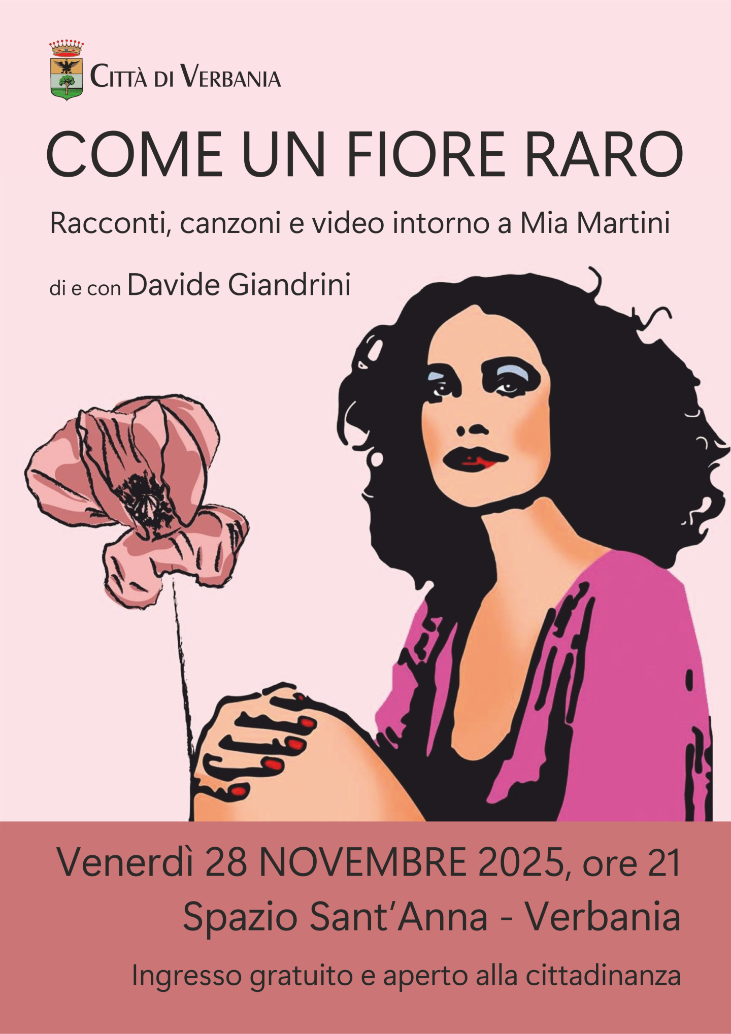 Venerdì 28 novembre 2025 ore 21:00 presso lo Spazio Sant'Anna - Verbania, vi sarà lo spettacolo "Come un fiore raro". " Un racconto con video, canzoni e testimonianze sulla vita di donna e artista di Mia Martini, una donna con le sue fragilità che le hanno anche permesso di essere una grandissima interprete. Si rifletterà su come le fragilità portino a rinascite ma anche a depressioni e abbandoni". Lo spettacolo è scritto e interpretato da Davide Giandrini ed è già stato rappresentato in molti teatri d'Italia.