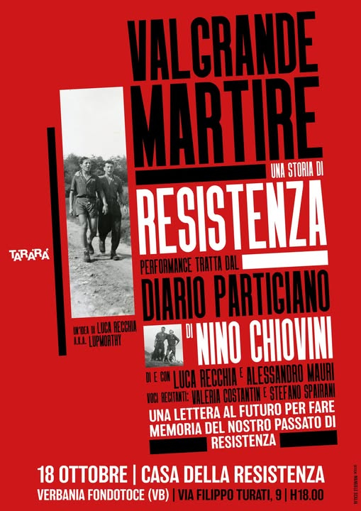 Sabato 18 ottobre alle ore 18.00 presso la Casa della Resistenza di Verbania Fondotoce, il Parco Letterario Nino Chiovini ha il piacere di ospitare lo spettacolo teatrale "Valgrande Martire. Una storia di Resistenza".