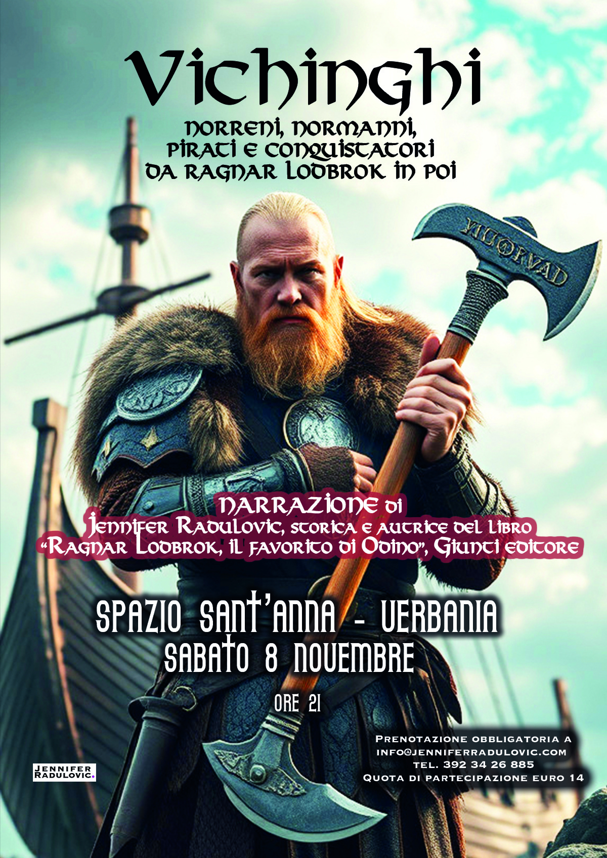 Una vivace Perfomance di narrazione (Talk, Storytelling, Divulgazione storica, Narrazione-spettacolo) a teatro. In occasione dell’uscita del suo ultimo libro RAGNAR LODBROK, IL FAVORITO DI ODINO, edito da Giunti Editore, JENNIFER RADULOVIC – storica, saggista e divulgatrice – presenta VICHINGHI: Norreni, Normanni, pirati e conquistatori da Ragnar Lodbrok in poi, un’avvincente Performance narrativa dedicata alla storia delle genti del Nord che a distanza di secoli continuano ad affascinare, a inquietare e ad attrarre.